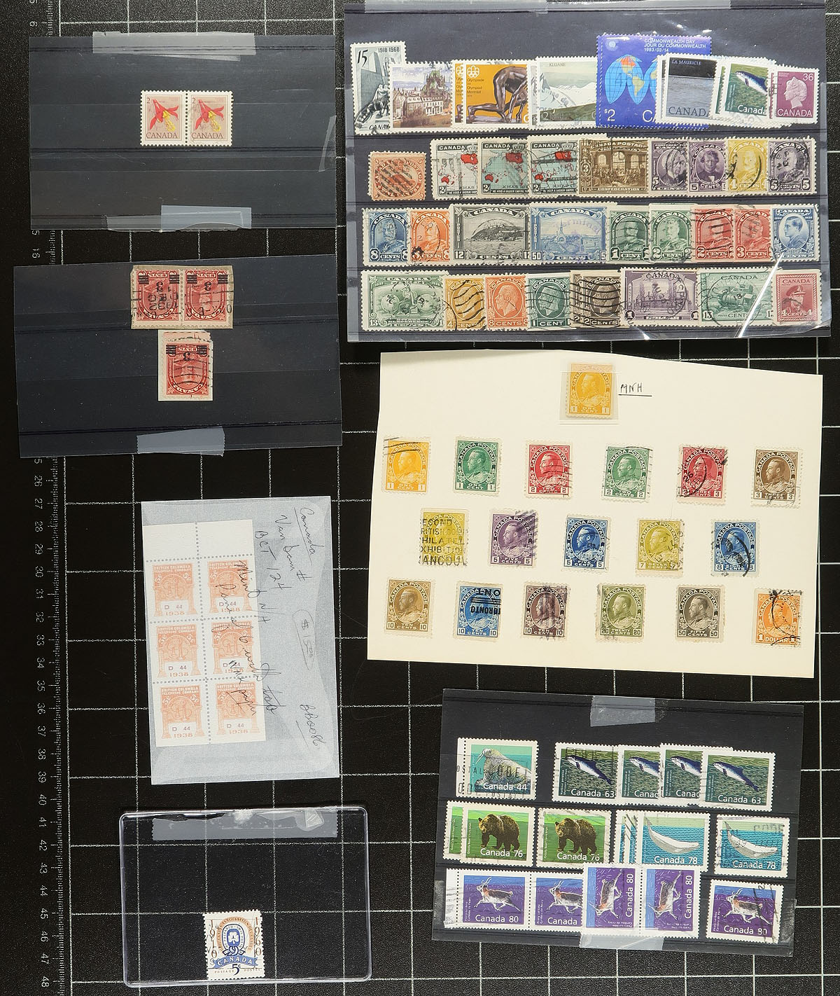Accumulation of used Canada, 1870's to modern, containing many hundreds of stamps in several stock cards and dealer 102 cards. A spot check indicated Small Queens, Jubilees (noting 50c), partial and complete sets of Leafs, Numeral, Edwards, Quebecs on up, including the 50c Bluenose (x5), modern issues (including a few varieties), and more. Postmark interest includes cds, duplex, squared circles, and more, including socked on the nose town cancels. Duplication up to 10 for a few issues. A nice lot with a potentially high catalogue value, for the used collector or postmark hunter. Estimate =
