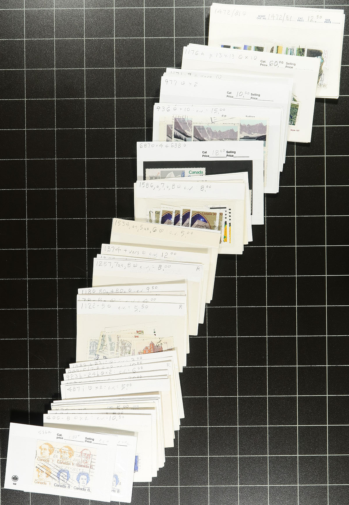 Accumulation of used Canada, 1870's to modern, containing many hundreds of stamps in several stock cards and dealer 102 cards. A spot check indicated Small Queens, Jubilees (noting 50c), partial and complete sets of Leafs, Numeral, Edwards, Quebecs on up, including the 50c Bluenose (x5), modern issues (including a few varieties), and more. Postmark interest includes cds, duplex, squared circles, and more, including socked on the nose town cancels. Duplication up to 10 for a few issues. A nice lot with a potentially high catalogue value, for the used collector or postmark hunter. Estimate =