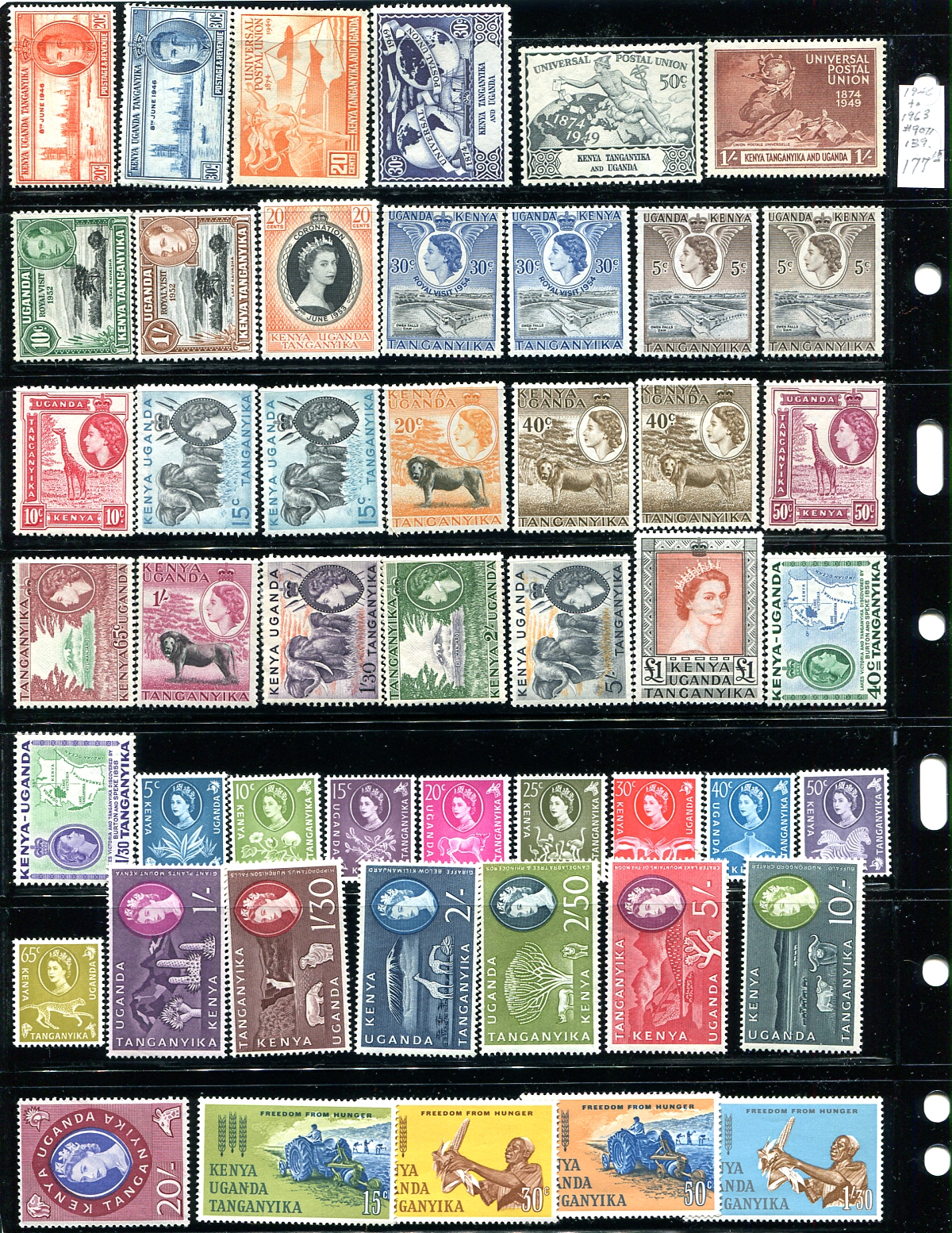 Attractive mint Lightly Hinged / Never Hinged group of 90 stamps, mostly all-different including complete sets, from George V to QEII on a double sided stockpage. The earlier material tends to be LH, eventually giving way to more NH (including the #120-135 set as NH). High quality material. 2025 Scott US$361.55 =