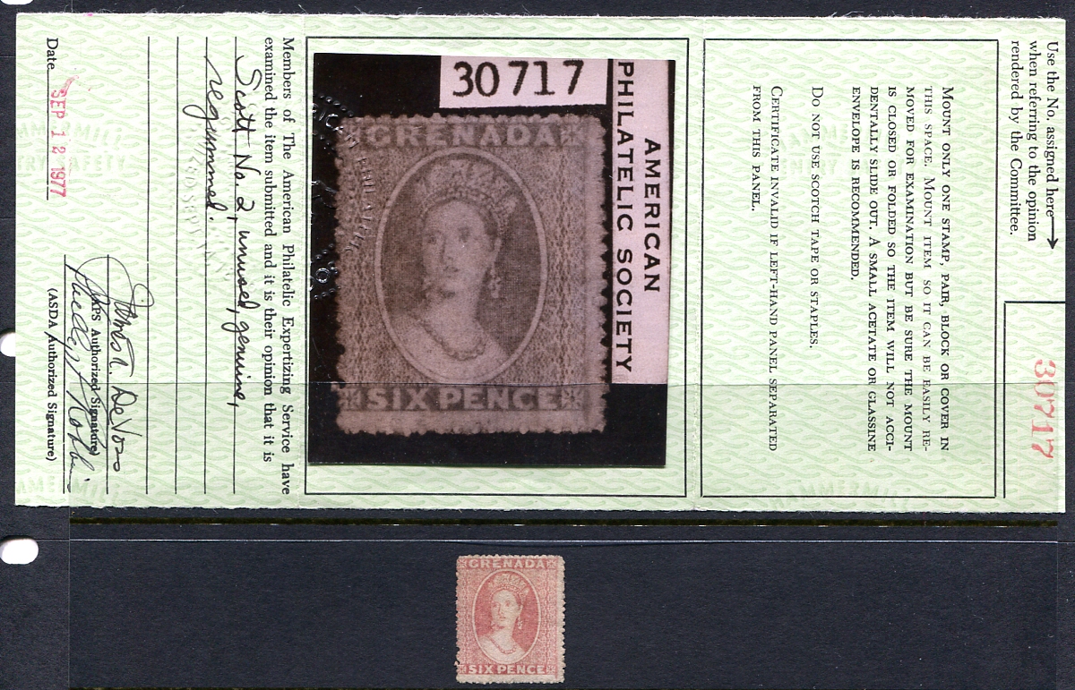 Fine mint hinged (regummed) example of the seldom seen 6p rose, 1861 issue Queen Victoria, accompanied by 1977 "APS" (American Philatelic Society) photo certificate, which states "Scott No.2, unused, genuine, regummed". You won't get many chances to fill this spot in the album! 2025 Scott US$1050.00 =