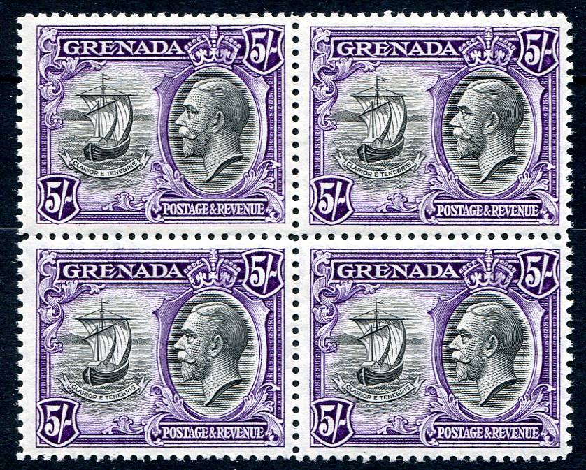 VF mint Lightly Hinged (top only) block of four of the 1934 George V Pictorial series "Seal of the Colony" 5sh violet and black high-value. Great colour and gum, an attractive block. 2025 Scott US$200.00 =