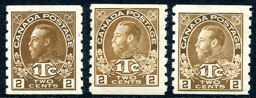 F/VF mint hinged examples of the Die I and Die II types of the 2c + 1c brown KGV War Tax coils, plus the Unitrade listed yellow-brown shade of Die I (MR7iii). Nice to put these all together to be able to notice the different dies / shades. The shade variety is not listed in Scott, so valued as the basic shade. 2025 Scott US$280.00 =
