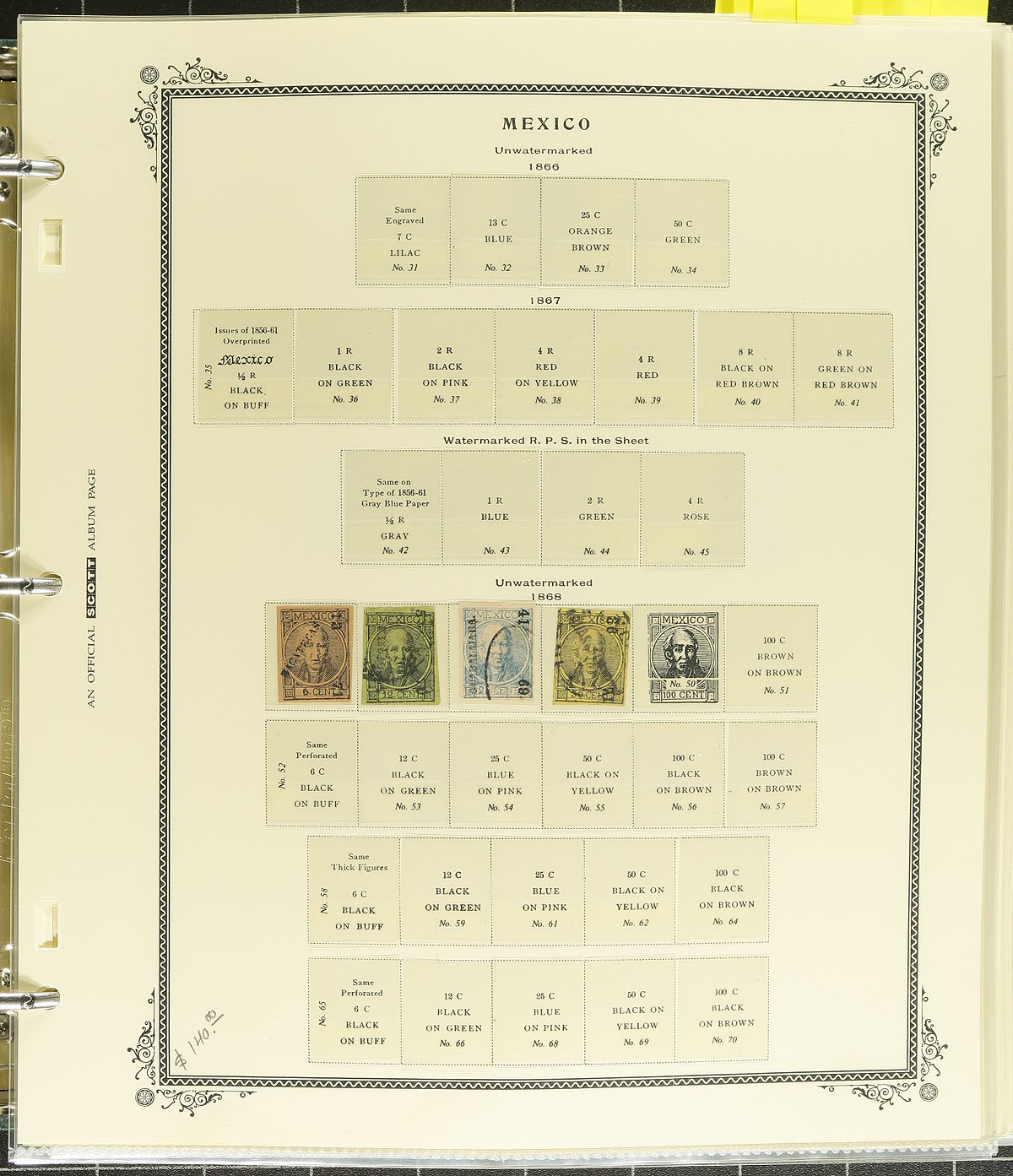 Lovely and valuable collection of primarily mint Mexico, 1856-1990, containing roughly 1,275 stamps (including strips and souvenir sheets), in a thick hingeless Scott Specialty album. The collection ranges from Scott #1/1650, noting just a few of the better stamps with #s 46-49 (used, $160 total), 114 (mh, $110), along with many singles, sets, and partial sets cataloguing $20 to $45 and up each. Owner's 2025 Scott catalogue for the collection totals $11,656, but use a cautious eye on some of the earlier material, and expect the odd fault. The online photos showing a sampling. A lovely collection that should be expanded, overall fine to very fine. 2025 Scott US$11656.00 =