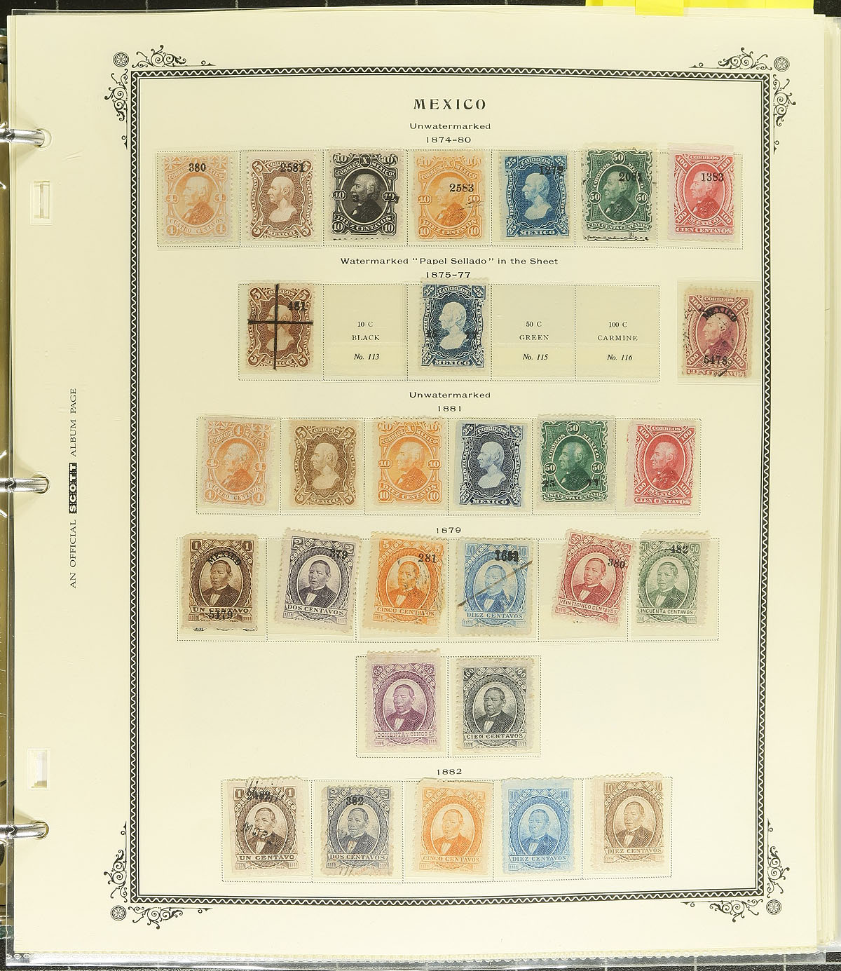 Lovely and valuable collection of primarily mint Mexico, 1856-1990, containing roughly 1,275 stamps (including strips and souvenir sheets), in a thick hingeless Scott Specialty album. The collection ranges from Scott #1/1650, noting just a few of the better stamps with #s 46-49 (used, $160 total), 114 (mh, $110), along with many singles, sets, and partial sets cataloguing $20 to $45 and up each. Owner's 2025 Scott catalogue for the collection totals $11,656, but use a cautious eye on some of the earlier material, and expect the odd fault. The online photos showing a sampling. A lovely collection that should be expanded, overall fine to very fine. 2025 Scott US$11656.00 =