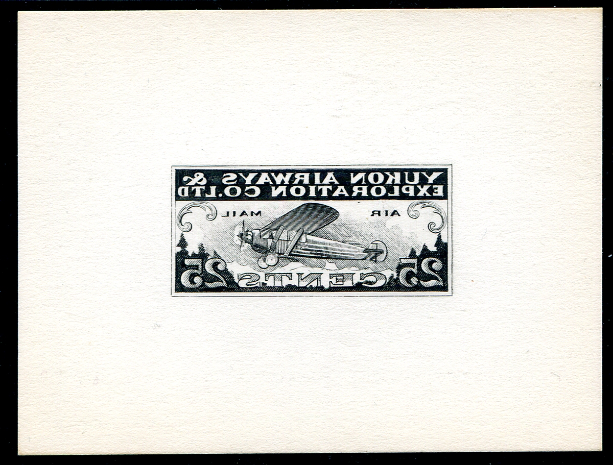 Semi Official Airmail, Yukon Airways & Exploration Co. Ltd 1927 REVERSE DIE PROOF in black, on thick card (measuring 99x76mm). An immaculate example of this seldom-seen DIE PROOF, crisp and as fresh as the day it was printed. A welcome addition to any collection. 2024 Unitrade =