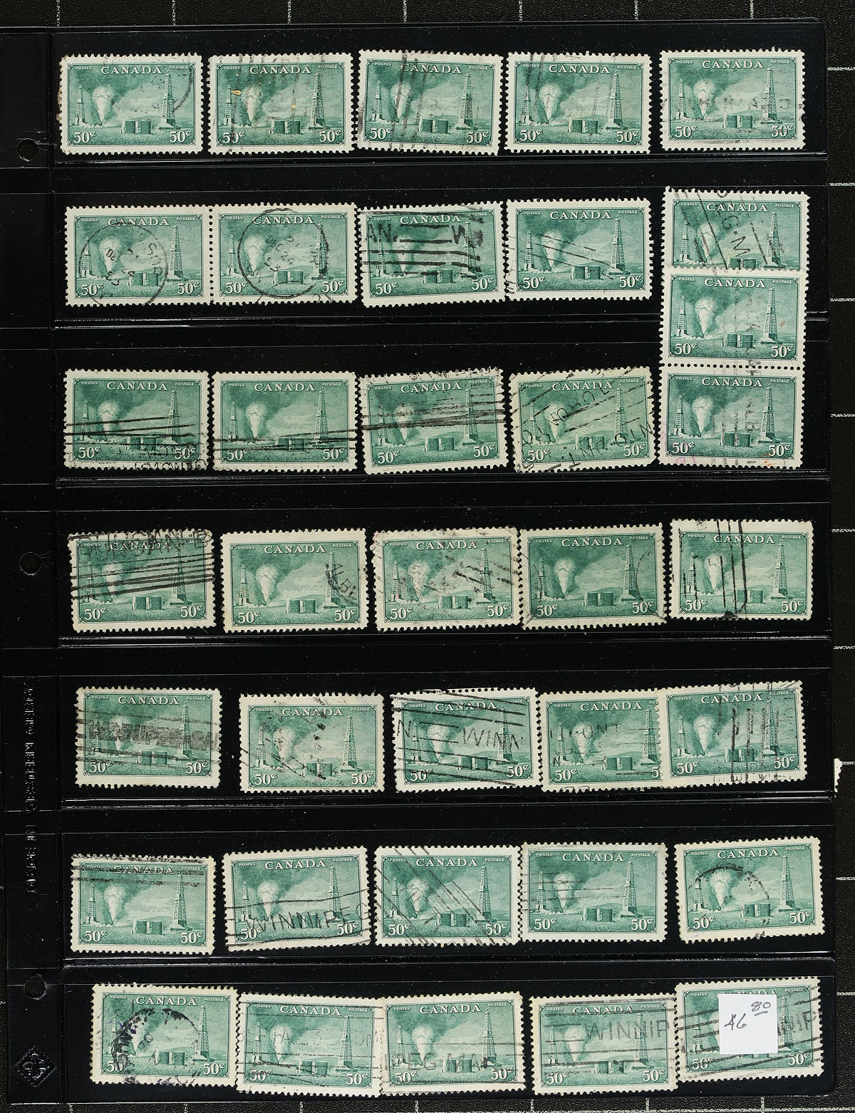 An "odd ball" assembly of "back of the book" plus 1950's high values and other "odds" that did not fit anywhere else (private perfins, consular service stamps, postmarks etc). Some of the highlights include #302 ($1.00 Fisheries) used x30, OHMS perfins, "G" and "O.H.M.S." officials (including high values), multiple 50c Oil Wells (including NWT postmarks) etc. All arranged (somewhat haphazardly) on stockpages. Not counting the Consular Stamps, owner's 2024 Scott US$1205.60 =