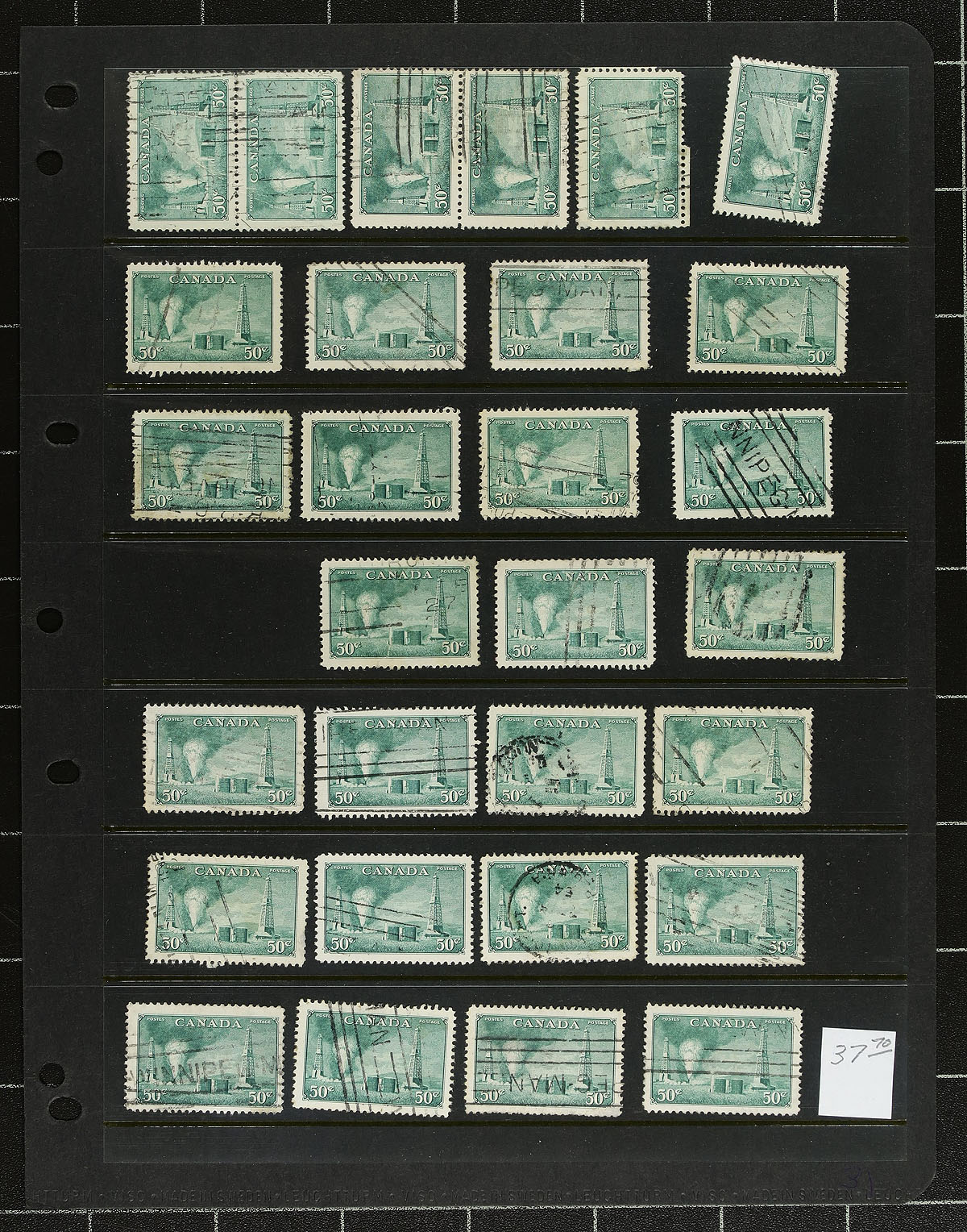 An "odd ball" assembly of "back of the book" plus 1950's high values and other "odds" that did not fit anywhere else (private perfins, consular service stamps, postmarks etc). Some of the highlights include #302 ($1.00 Fisheries) used x30, OHMS perfins, "G" and "O.H.M.S." officials (including high values), multiple 50c Oil Wells (including NWT postmarks) etc. All arranged (somewhat haphazardly) on stockpages. Not counting the Consular Stamps, owner's 2024 Scott US$1205.60 =