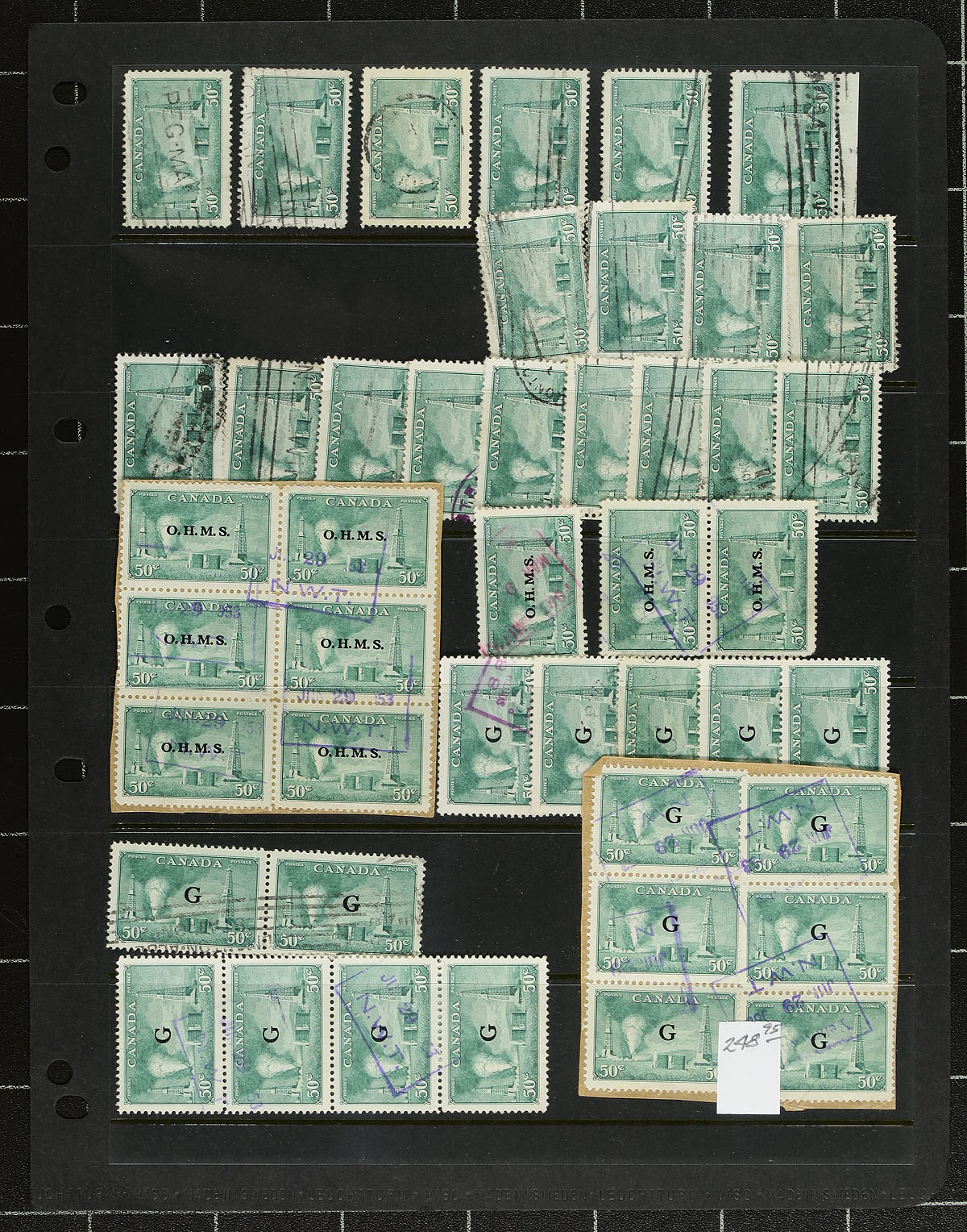 An "odd ball" assembly of "back of the book" plus 1950's high values and other "odds" that did not fit anywhere else (private perfins, consular service stamps, postmarks etc). Some of the highlights include #302 ($1.00 Fisheries) used x30, OHMS perfins, "G" and "O.H.M.S." officials (including high values), multiple 50c Oil Wells (including NWT postmarks) etc. All arranged (somewhat haphazardly) on stockpages. Not counting the Consular Stamps, owner's 2024 Scott US$1205.60 =