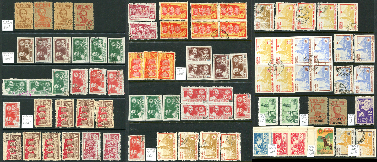Stunning old-time stock of 1948-1959 North Vietnamese material, consisting of 84 stamps neatly arranged on 3 stockpages. A mix of mint and used, imperforates, revalues, blocks etc. Some reprints do exist, so view with a cautious eye, but overall these look good, and came from the estate of a very knowledgeable collector. 2025 Scott US$2069.50 =