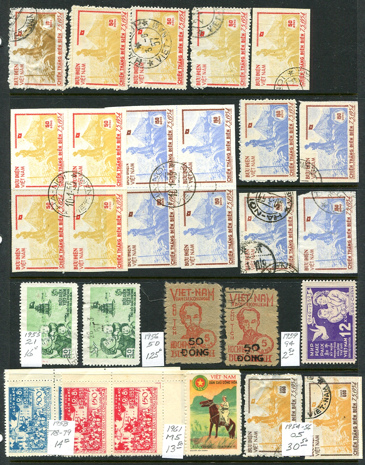 Stunning old-time stock of 1948-1959 North Vietnamese material, consisting of 84 stamps neatly arranged on 3 stockpages. A mix of mint and used, imperforates, revalues, blocks etc. Some reprints do exist, so view with a cautious eye, but overall these look good, and came from the estate of a very knowledgeable collector. 2025 Scott US$2069.50 =
