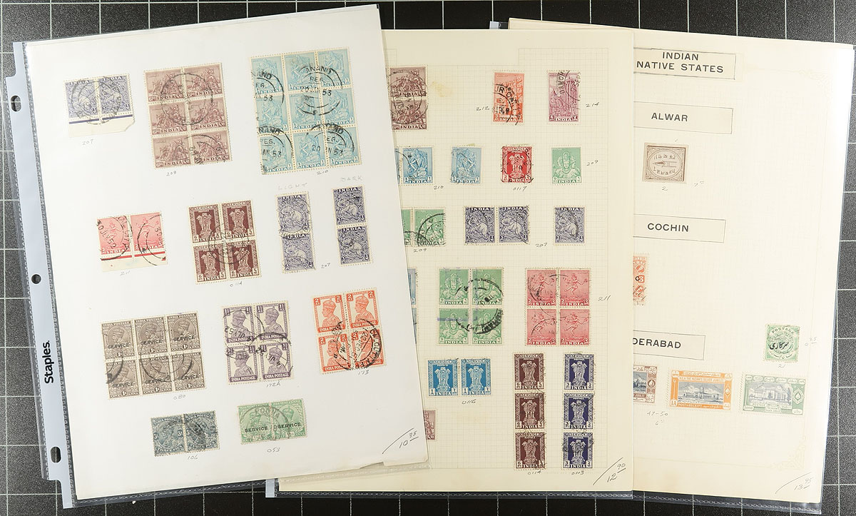 A wild ride of mint and used India 1854-1951 arranged on a collector's home-made pages. Includes a range between #2/232, plus Officials, Military Stamps, Airmail and Indian States. A total of 1435 stamps, with duplication, but also a wealth of postmark interest. An old-time holding, which we have cleaned up a bit (and put the loose stamps on a stockpage). Expect a few small faults, but overall a very clean and interesting offering. Catalogued in 2025 Scott at $2429.35 ($3279.60 CDN), but since this lot is so diverse, we have decided to use an estimate instead. Estimate =