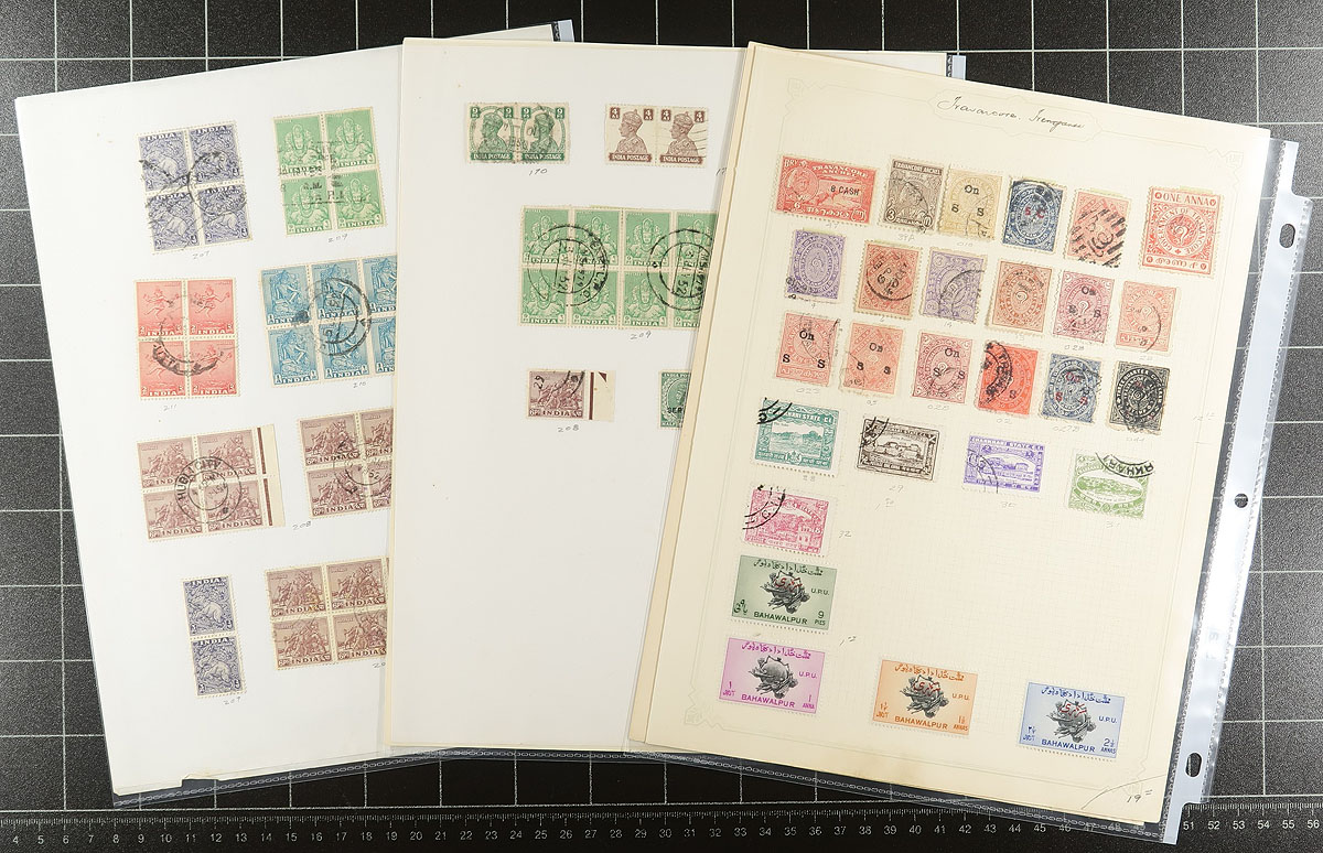 A wild ride of mint and used India 1854-1951 arranged on a collector's home-made pages. Includes a range between #2/232, plus Officials, Military Stamps, Airmail and Indian States. A total of 1435 stamps, with duplication, but also a wealth of postmark interest. An old-time holding, which we have cleaned up a bit (and put the loose stamps on a stockpage). Expect a few small faults, but overall a very clean and interesting offering. Catalogued in 2025 Scott at $2429.35 ($3279.60 CDN), but since this lot is so diverse, we have decided to use an estimate instead. Estimate =