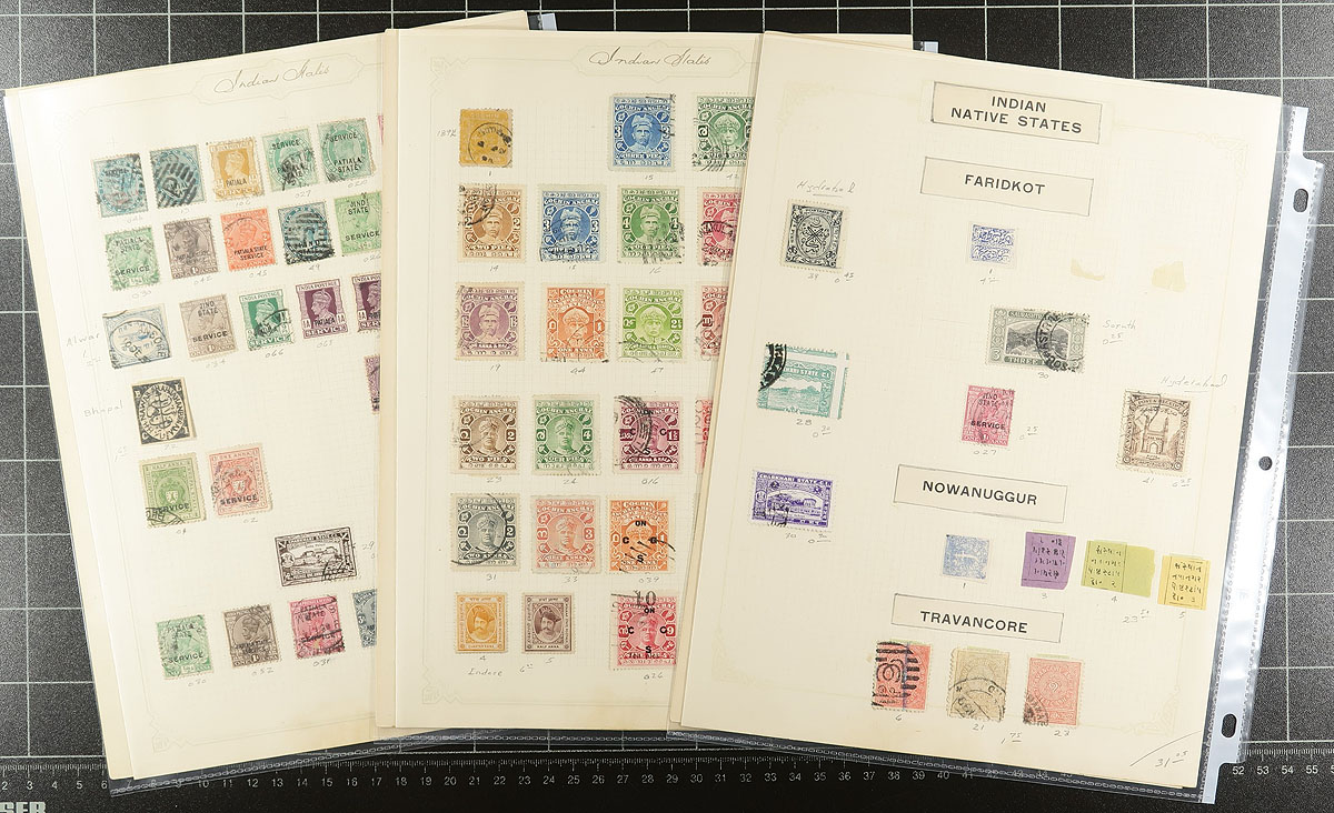 A wild ride of mint and used India 1854-1951 arranged on a collector's home-made pages. Includes a range between #2/232, plus Officials, Military Stamps, Airmail and Indian States. A total of 1435 stamps, with duplication, but also a wealth of postmark interest. An old-time holding, which we have cleaned up a bit (and put the loose stamps on a stockpage). Expect a few small faults, but overall a very clean and interesting offering. Catalogued in 2025 Scott at $2429.35 ($3279.60 CDN), but since this lot is so diverse, we have decided to use an estimate instead. Estimate =