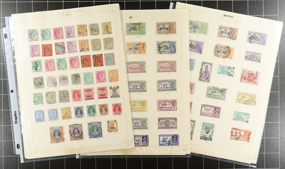 A wild ride of mint and used India 1854-1951 arranged on a collector's home-made pages. Includes a range between #2/232, plus Officials, Military Stamps, Airmail and Indian States. A total of 1435 stamps, with duplication, but also a wealth of postmark interest. An old-time holding, which we have cleaned up a bit (and put the loose stamps on a stockpage). Expect a few small faults, but overall a very clean and interesting offering. Catalogued in 2025 Scott at $2429.35 ($3279.60 CDN), but since this lot is so diverse, we have decided to use an estimate instead. Estimate =