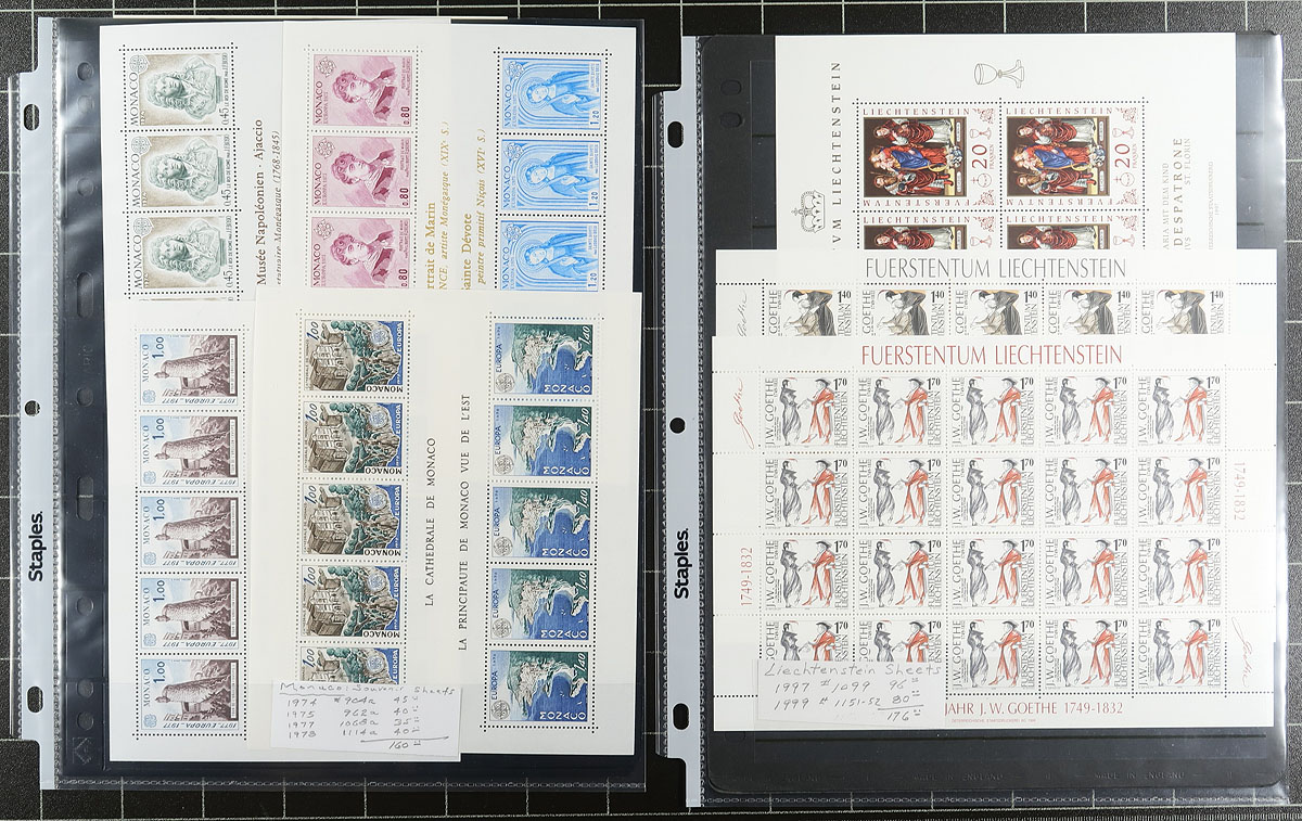 A "duo" of lots, which were not quite enough on their own, so combined to make an enticing offering. The first portion consists of Monaco 1974-1985 Europa souvenir sheets, with 5 sheets of 10 stamps, #904a/1465a (catalogue US$185.00). The second portion consists of Liechtenstein sheets 1995-2000, with 16 sheetlets of either 8 or 20 stamps, #1056/1192 (catalogue $661.00). All in Post Office fresh mint Never Hinged condition. 2025 Scott US$846.00 =