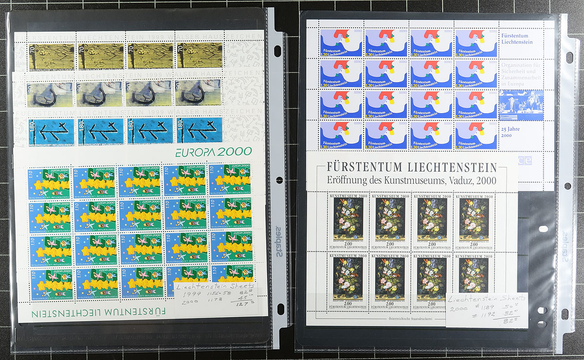 A "duo" of lots, which were not quite enough on their own, so combined to make an enticing offering. The first portion consists of Monaco 1974-1985 Europa souvenir sheets, with 5 sheets of 10 stamps, #904a/1465a (catalogue US$185.00). The second portion consists of Liechtenstein sheets 1995-2000, with 16 sheetlets of either 8 or 20 stamps, #1056/1192 (catalogue $661.00). All in Post Office fresh mint Never Hinged condition. 2025 Scott US$846.00 =