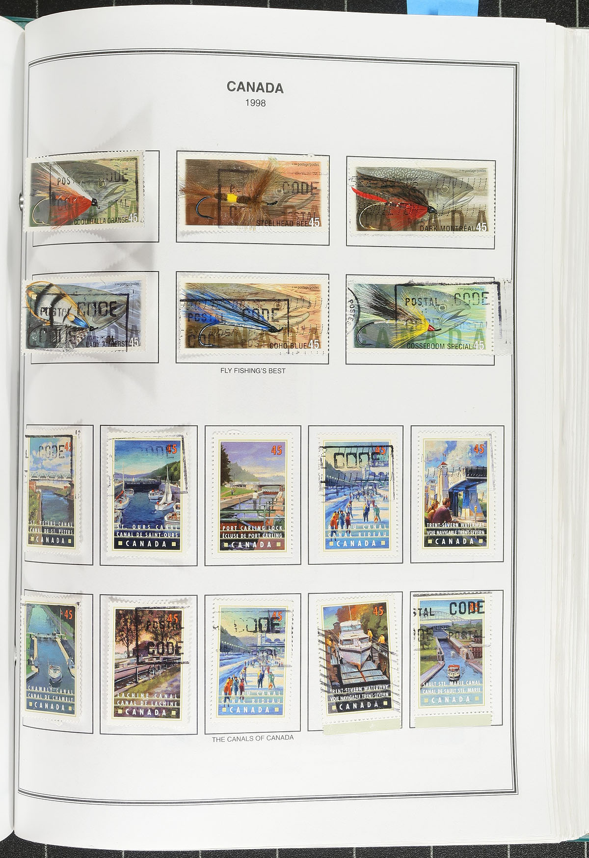 Large collection of used Canada, 1859-2006, containing over 3,000 stamps in a thick Harris album. The collection begins with a few early issues including #s 15, 21, 24, 26-27, with partial sets of Leafs, Numerals, Edwards, Quebecs, with complete sets starting with Admirals, Scrolls, Arch, Pictorials, up to the Peace issues. The collection is fairly complete (roughly 85% in period), from the 1950's to 2006. Duplication up to 2 for some issues, with a few mint hinged stamps found under a used example. A nice collection, including a few socked on the nose town cancels, a few faults with the early issues, overall fine to very fine. Estimate =