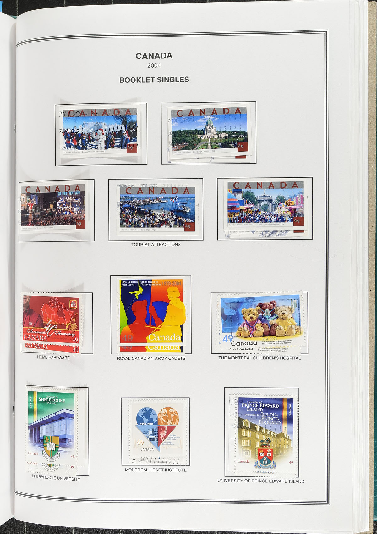 Large collection of used Canada, 1859-2006, containing over 3,000 stamps in a thick Harris album. The collection begins with a few early issues including #s 15, 21, 24, 26-27, with partial sets of Leafs, Numerals, Edwards, Quebecs, with complete sets starting with Admirals, Scrolls, Arch, Pictorials, up to the Peace issues. The collection is fairly complete (roughly 85% in period), from the 1950's to 2006. Duplication up to 2 for some issues, with a few mint hinged stamps found under a used example. A nice collection, including a few socked on the nose town cancels, a few faults with the early issues, overall fine to very fine. Estimate =