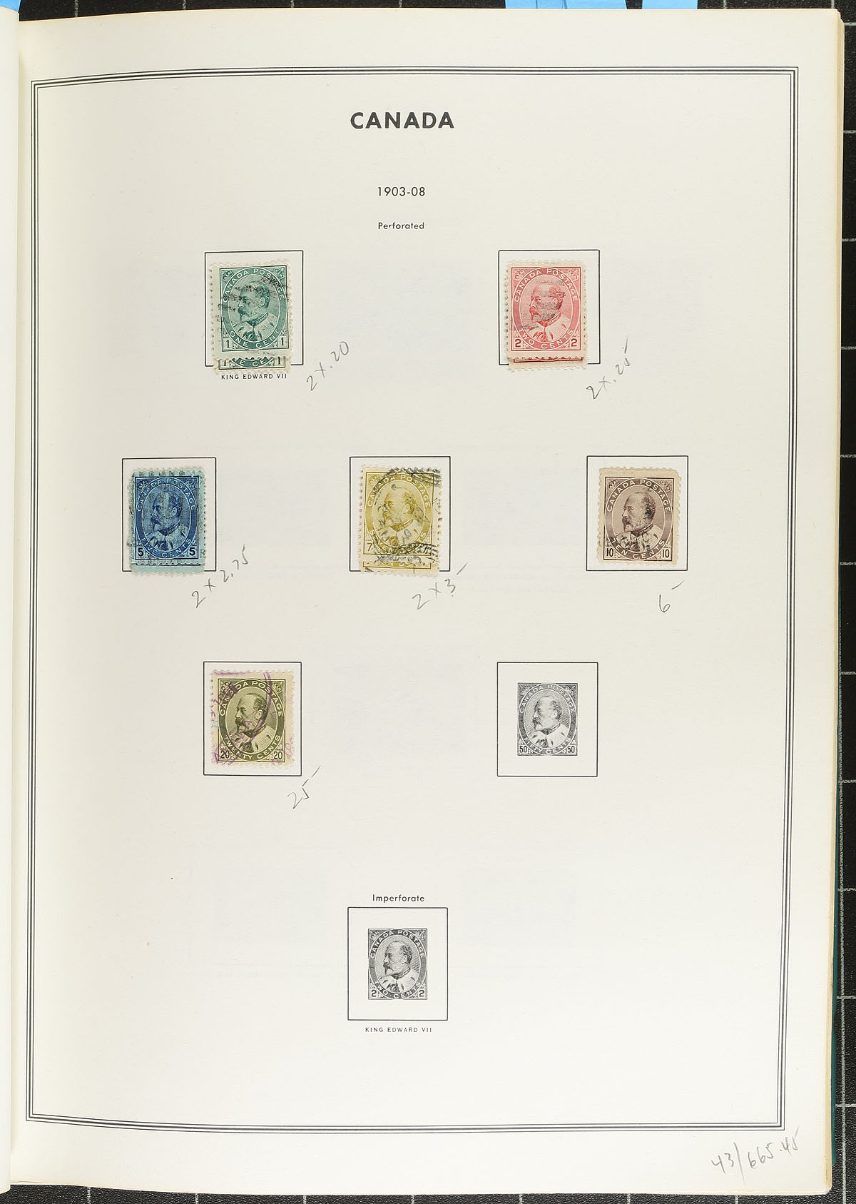 Large collection of used Canada, 1859-2006, containing over 3,000 stamps in a thick Harris album. The collection begins with a few early issues including #s 15, 21, 24, 26-27, with partial sets of Leafs, Numerals, Edwards, Quebecs, with complete sets starting with Admirals, Scrolls, Arch, Pictorials, up to the Peace issues. The collection is fairly complete (roughly 85% in period), from the 1950's to 2006. Duplication up to 2 for some issues, with a few mint hinged stamps found under a used example. A nice collection, including a few socked on the nose town cancels, a few faults with the early issues, overall fine to very fine. Estimate =