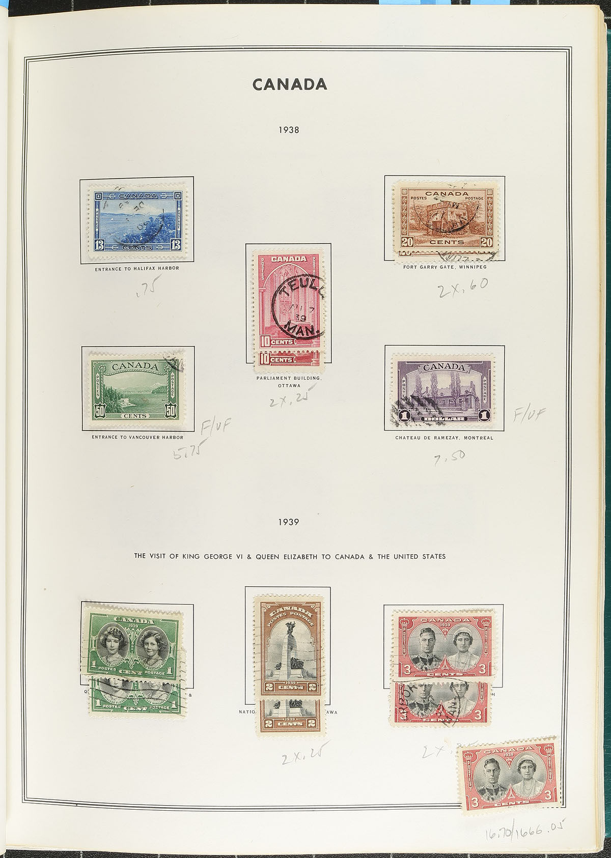 Large collection of used Canada, 1859-2006, containing over 3,000 stamps in a thick Harris album. The collection begins with a few early issues including #s 15, 21, 24, 26-27, with partial sets of Leafs, Numerals, Edwards, Quebecs, with complete sets starting with Admirals, Scrolls, Arch, Pictorials, up to the Peace issues. The collection is fairly complete (roughly 85% in period), from the 1950's to 2006. Duplication up to 2 for some issues, with a few mint hinged stamps found under a used example. A nice collection, including a few socked on the nose town cancels, a few faults with the early issues, overall fine to very fine. Estimate =