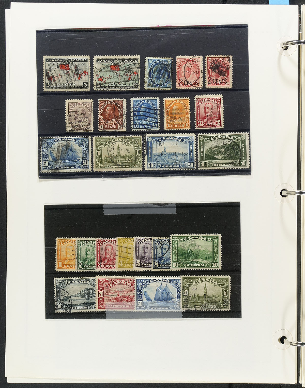 Nice collection of Used Canada, 1903-1984, containing many hundreds of stamps on Jarrett album pages, and a few sets on stockcards on the backs of a few pages. The collection is roughly 90% complete in period (missing later issues), and includes some coil pairs, staring with complete sets of Edwards, Quebecs, Admirals, Scrolls, Arch, up to the Peace issues. Postmark interest includes several cds cancels including a few "socked on the nose". A nice collection that should be continued, overall fine to very fine. Estimate =