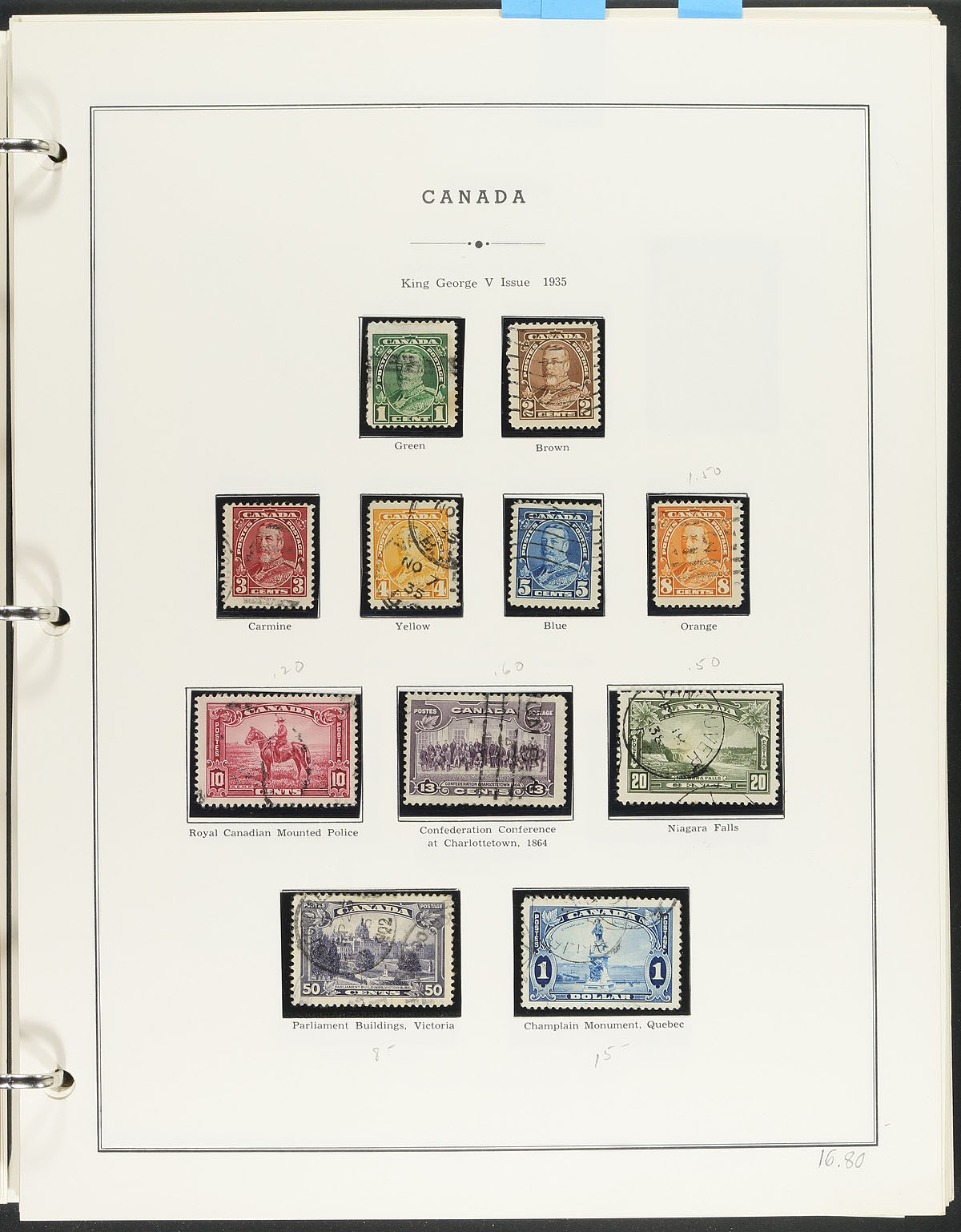 Nice collection of Used Canada, 1903-1984, containing many hundreds of stamps on Jarrett album pages, and a few sets on stockcards on the backs of a few pages. The collection is roughly 90% complete in period (missing later issues), and includes some coil pairs, staring with complete sets of Edwards, Quebecs, Admirals, Scrolls, Arch, up to the Peace issues. Postmark interest includes several cds cancels including a few "socked on the nose". A nice collection that should be continued, overall fine to very fine. Estimate =
