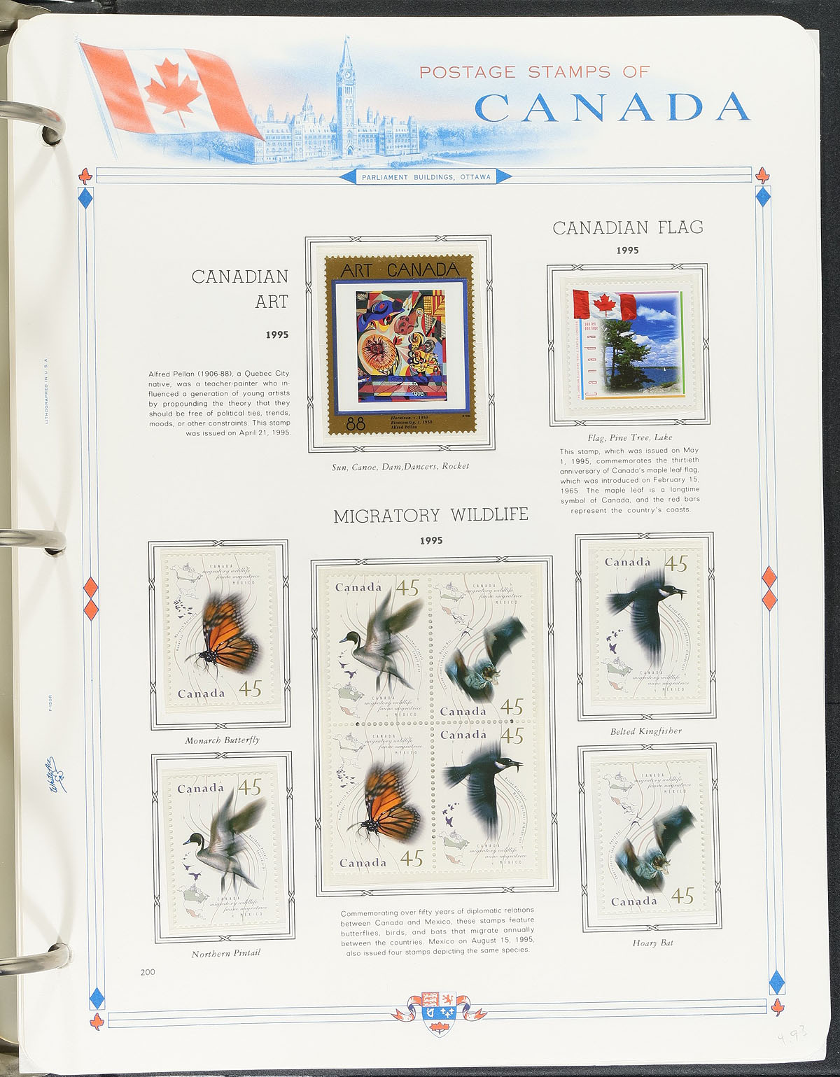 Lovely collection of mint never hinged Canada, 1983-1995, containing several hundreds of stamps, on over 100 hingeless White Ace album pages housed in a thick binder. The collection ranges from Unitrade #924/1587, noting singles, pairs, blocks, souvenir sheets, and a few booklets. Face value alone totals $330.00. Online photos show a few sample pages. A nice collection that should be expanded. Conservatively valued for the total postage value alone. Total face value =