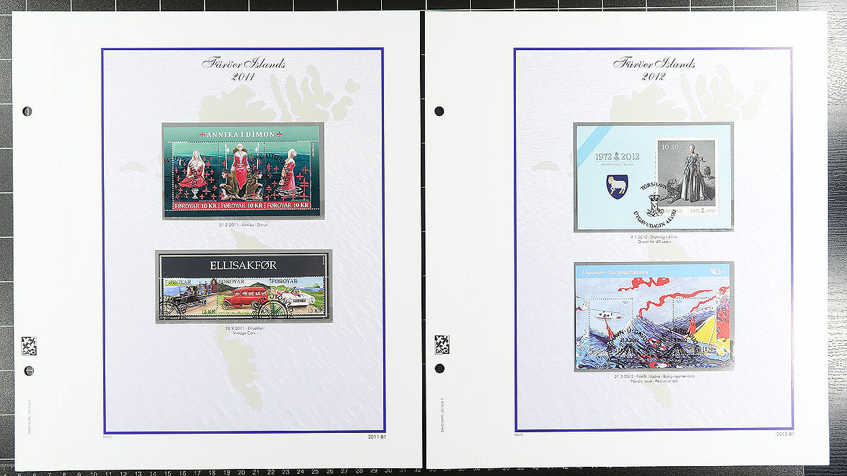 Two specialty Davo hingeless albums. The first features a very complete run of used souvenir sheets, all with first day cancels (catalogue value US$639.50) and in excellent condition. The second volume showcases complete sheets of Faroe Island Christmas Seals issued between 1976-2016. The albums alone would cost at least $300.00! Estimate =