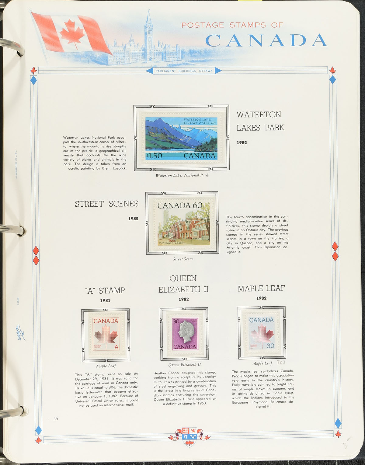 Collection of mint Canada, 1868-1993, containing many hundreds of stamps in hingeless White Ace album pages, housed in a thick binder. The collection begins with a sparse selection of stamps, but did note a few better including Scott #s 21 (lh, $175), 36 (mh, $70), along with mint hinged War and Peace sets. The collection begins to have better completeness post 1950 and almost exclusively never hinged material up to 1993. Face value alone totals $123.00. A nice starter collection, a few faults with a few of the early stamps, overall fine to very fine. Estimate =
