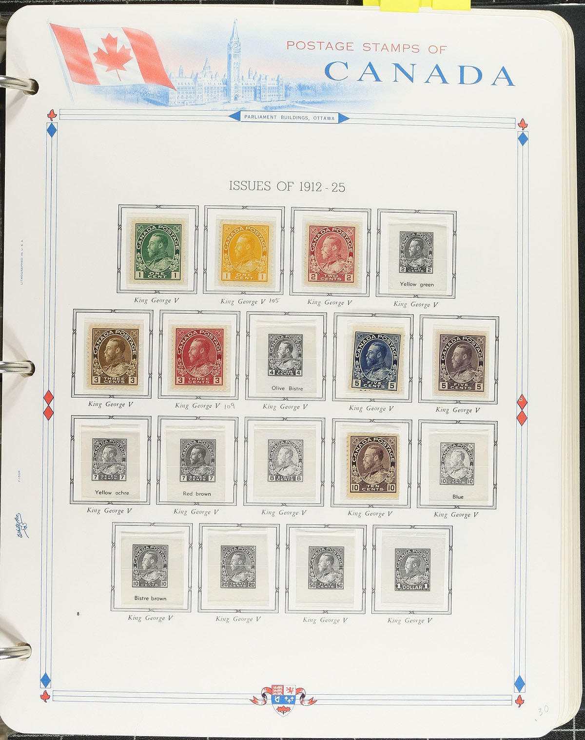 Collection of mint Canada, 1868-1993, containing many hundreds of stamps in hingeless White Ace album pages, housed in a thick binder. The collection begins with a sparse selection of stamps, but did note a few better including Scott #s 21 (lh, $175), 36 (mh, $70), along with mint hinged War and Peace sets. The collection begins to have better completeness post 1950 and almost exclusively never hinged material up to 1993. Face value alone totals $123.00. A nice starter collection, a few faults with a few of the early stamps, overall fine to very fine. Estimate =