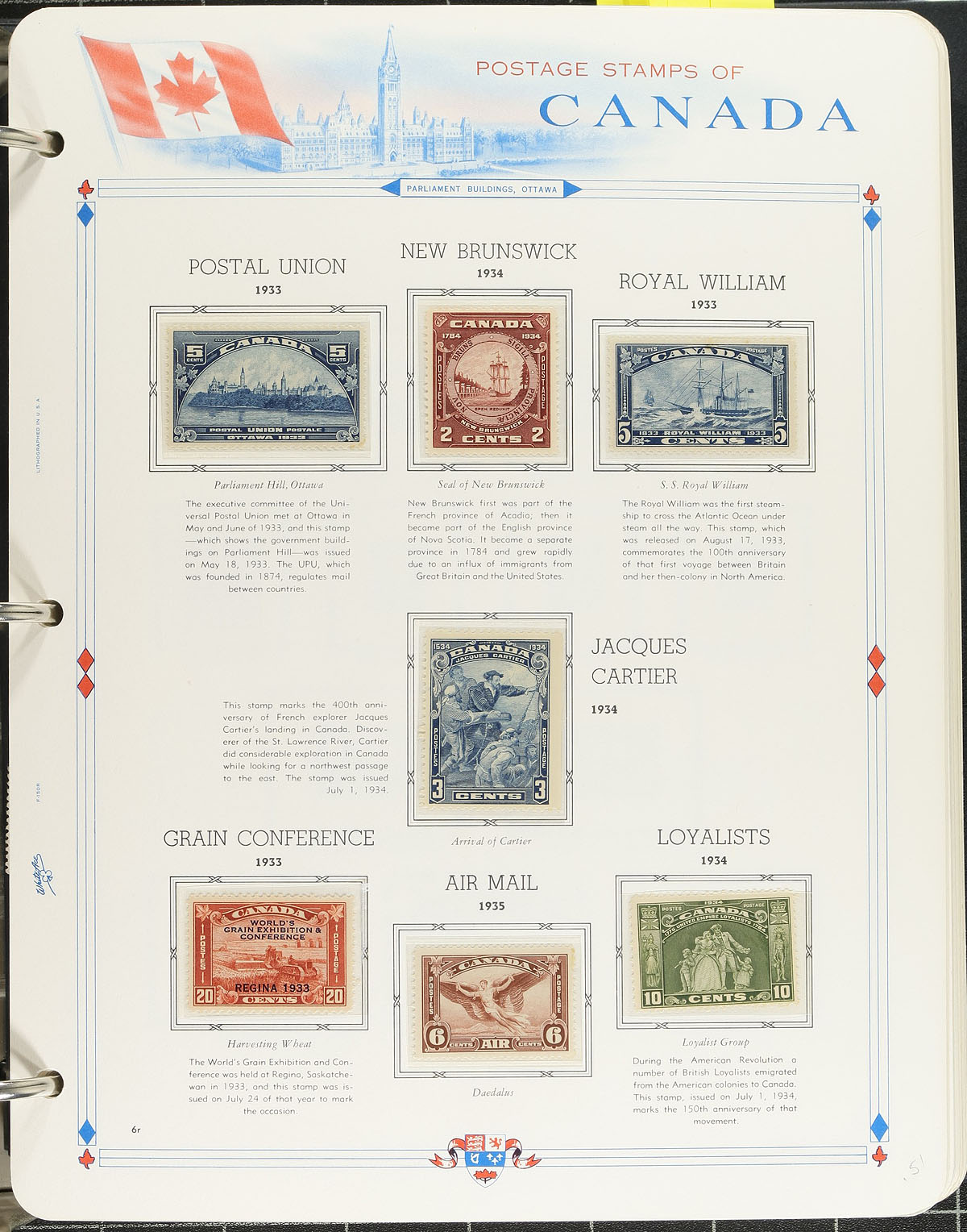 Collection of mint Canada, 1868-1993, containing many hundreds of stamps in hingeless White Ace album pages, housed in a thick binder. The collection begins with a sparse selection of stamps, but did note a few better including Scott #s 21 (lh, $175), 36 (mh, $70), along with mint hinged War and Peace sets. The collection begins to have better completeness post 1950 and almost exclusively never hinged material up to 1993. Face value alone totals $123.00. A nice starter collection, a few faults with a few of the early stamps, overall fine to very fine. Estimate =