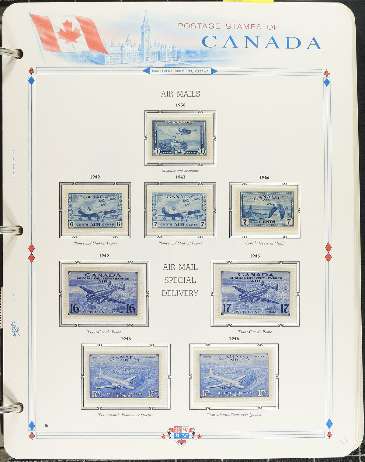 Collection of mint Canada, 1868-1993, containing many hundreds of stamps in hingeless White Ace album pages, housed in a thick binder. The collection begins with a sparse selection of stamps, but did note a few better including Scott #s 21 (lh, $175), 36 (mh, $70), along with mint hinged War and Peace sets. The collection begins to have better completeness post 1950 and almost exclusively never hinged material up to 1993. Face value alone totals $123.00. A nice starter collection, a few faults with a few of the early stamps, overall fine to very fine. Estimate =