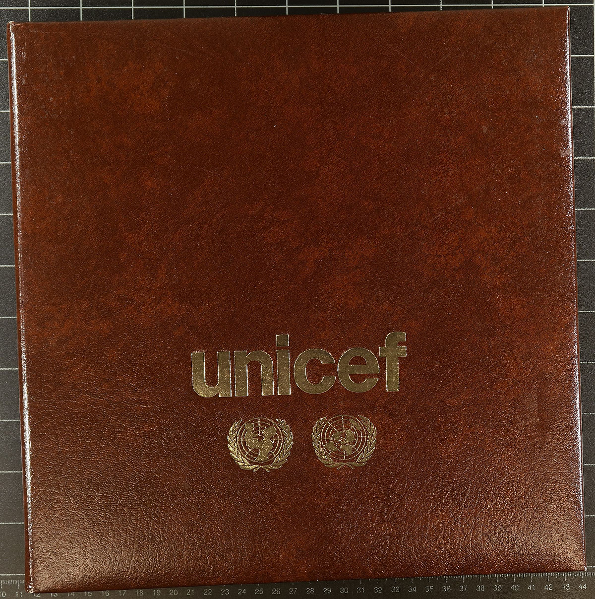 Group of Thematic collections and material filling a carton including: Unicef collection in 4 volumes, U.N. Flag sets 1985-1986, 3 "Our World" packs, FDC Cover of the Month, British Royalty stamps, and a stockbook containing mint sets with a scenery theme. A nice mixture of stamps and covers for the thematic or topical collector. Estimate =