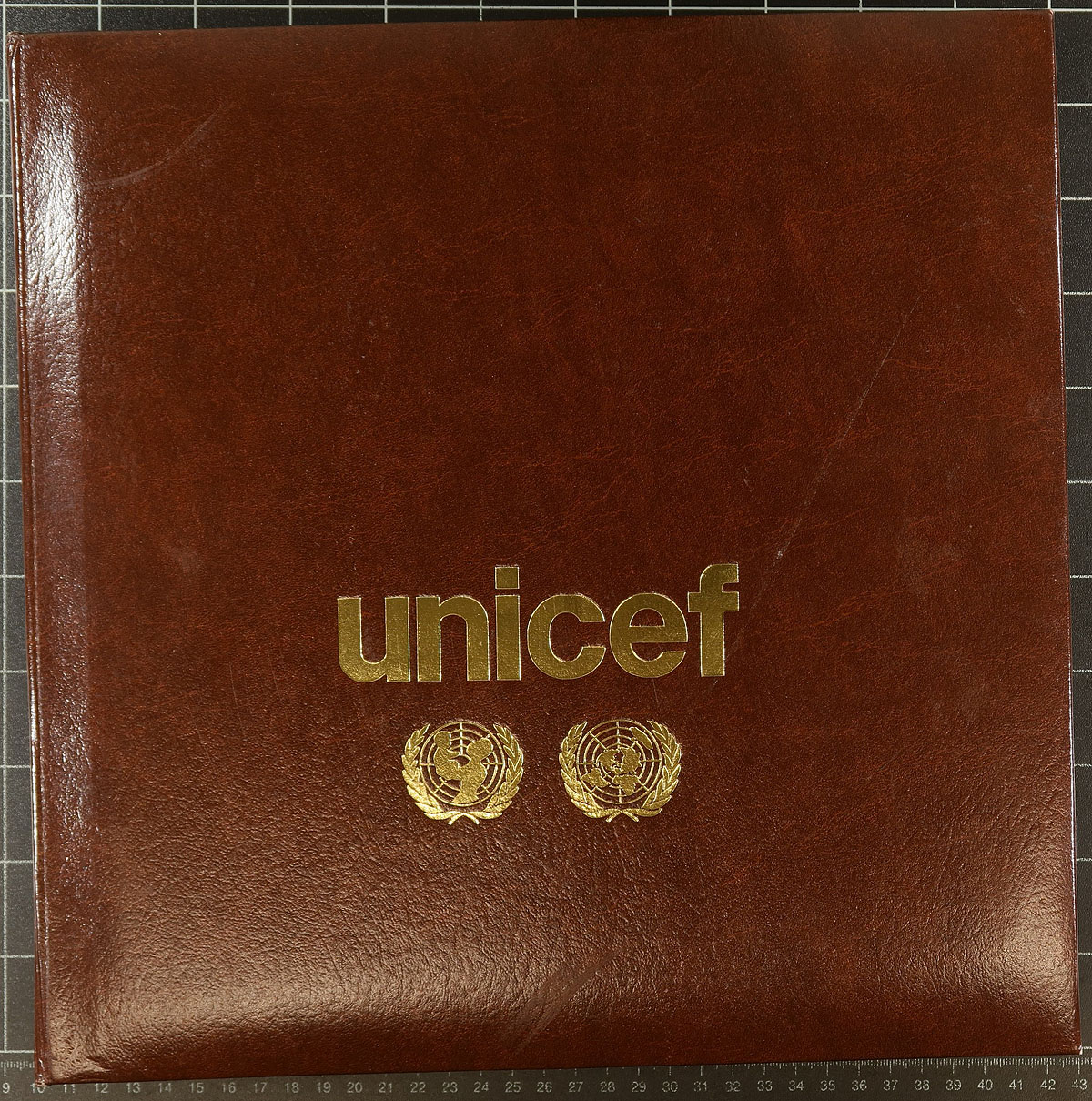 Group of Thematic collections and material filling a carton including: Unicef collection in 4 volumes, U.N. Flag sets 1985-1986, 3 "Our World" packs, FDC Cover of the Month, British Royalty stamps, and a stockbook containing mint sets with a scenery theme. A nice mixture of stamps and covers for the thematic or topical collector. Estimate =