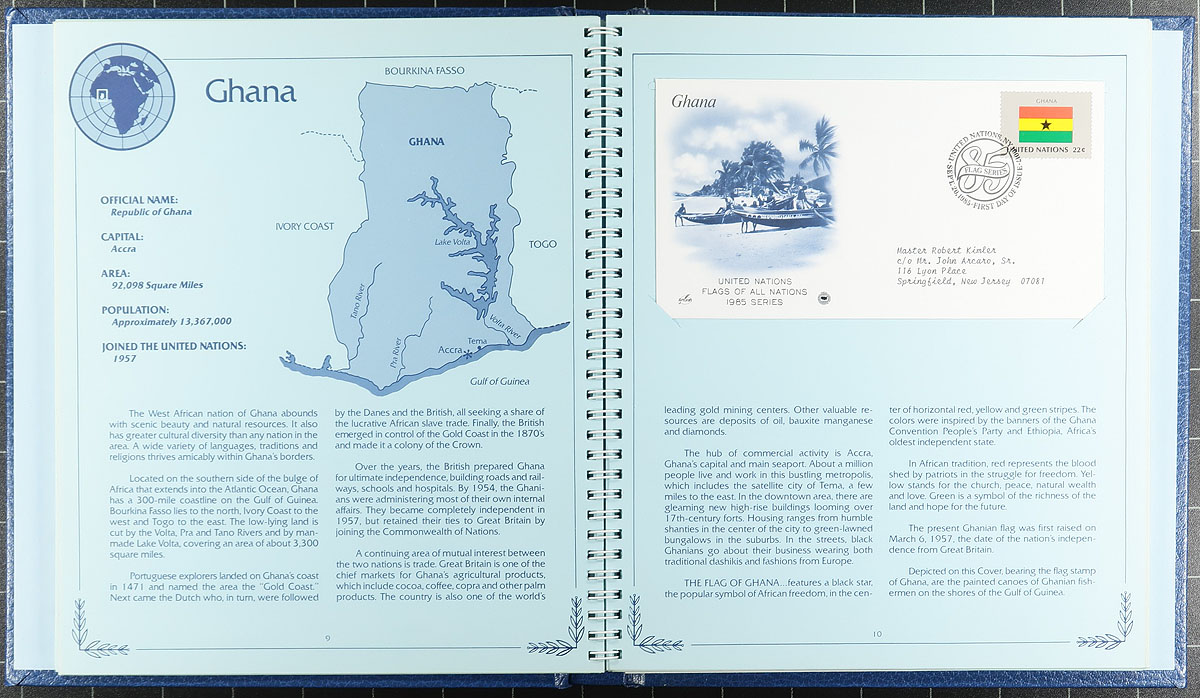 Group of Thematic collections and material filling a carton including: Unicef collection in 4 volumes, U.N. Flag sets 1985-1986, 3 "Our World" packs, FDC Cover of the Month, British Royalty stamps, and a stockbook containing mint sets with a scenery theme. A nice mixture of stamps and covers for the thematic or topical collector. Estimate =