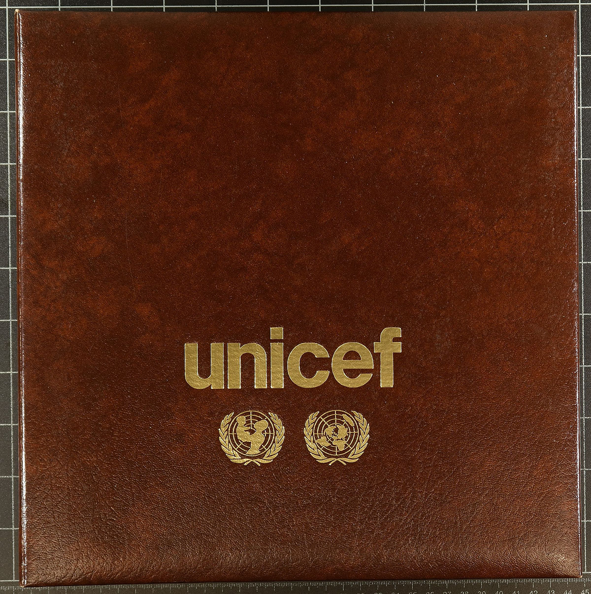 Group of Thematic collections and material filling a carton including: Unicef collection in 4 volumes, U.N. Flag sets 1985-1986, 3 "Our World" packs, FDC Cover of the Month, British Royalty stamps, and a stockbook containing mint sets with a scenery theme. A nice mixture of stamps and covers for the thematic or topical collector. Estimate =