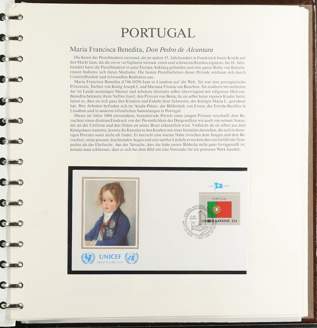 Group of Thematic collections and material filling a carton including: Unicef collection in 4 volumes, U.N. Flag sets 1985-1986, 3 "Our World" packs, FDC Cover of the Month, British Royalty stamps, and a stockbook containing mint sets with a scenery theme. A nice mixture of stamps and covers for the thematic or topical collector. Estimate =