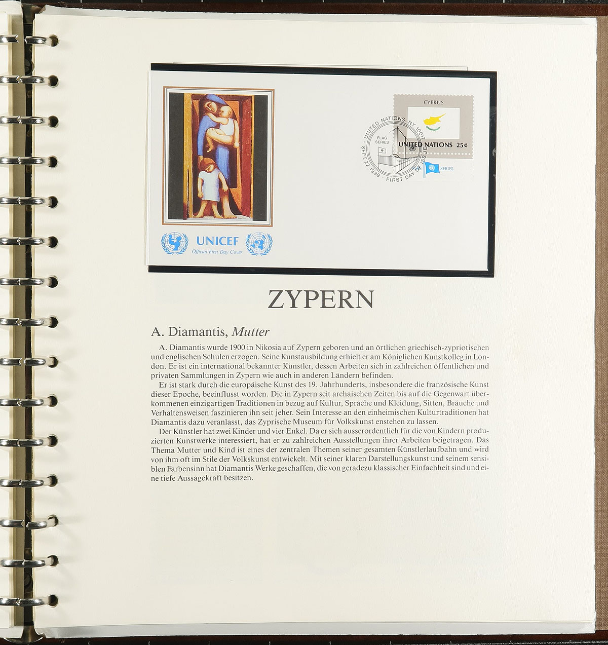 Group of Thematic collections and material filling a carton including: Unicef collection in 4 volumes, U.N. Flag sets 1985-1986, 3 "Our World" packs, FDC Cover of the Month, British Royalty stamps, and a stockbook containing mint sets with a scenery theme. A nice mixture of stamps and covers for the thematic or topical collector. Estimate =