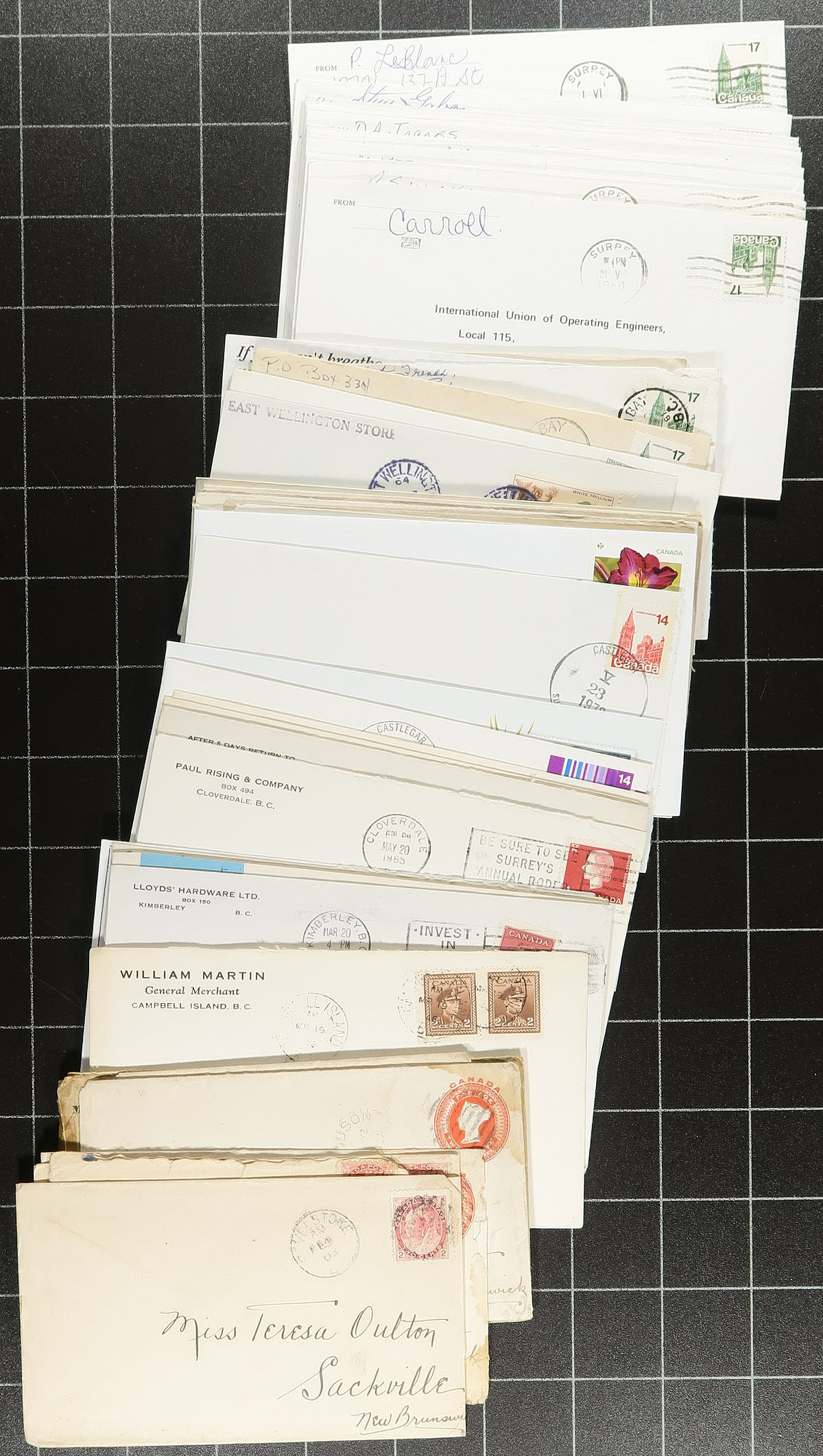 British Columbia Postal History. Accumulation of roughly 800 covers with British Columbia postmarks. A cursory check indicated the majority of material from the 1970's to the 1990's, but did note material from the late Victorian era on up. Most of the covers appear to be first class mail on #10 sized envelopes, but also includes postal stationery, first day covers, and other sized covers, along with a few incoming covers to British Columbia. Just a few of the postmarks encountered include cds, duplex, POCON, Klussendorf, machine, pictorial, and other probable postmark types, leaving possible finds to the specialist. A few faults with a few of the covers. Estimate =