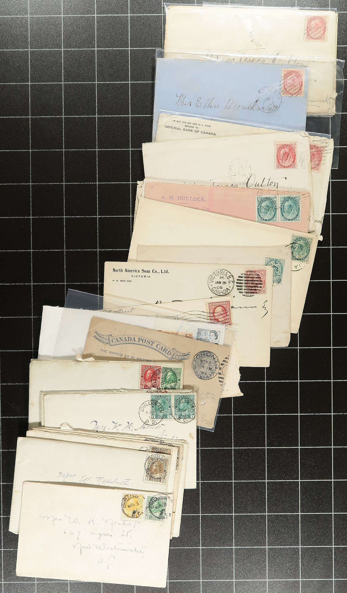 British Columbia Postal History. Accumulation of roughly 800 covers with British Columbia postmarks. A cursory check indicated the majority of material from the 1970's to the 1990's, but did note material from the late Victorian era on up. Most of the covers appear to be first class mail on #10 sized envelopes, but also includes postal stationery, first day covers, and other sized covers, along with a few incoming covers to British Columbia. Just a few of the postmarks encountered include cds, duplex, POCON, Klussendorf, machine, pictorial, and other probable postmark types, leaving possible finds to the specialist. A few faults with a few of the covers. Estimate =