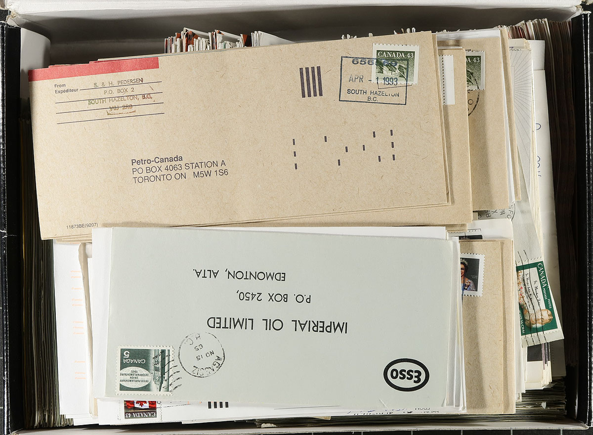 British Columbia Postal History. Group of over 500 covers collected for B.C. town postmarks, 1940's-1980's, noting towns from A to Y, with mostly POCON and MOON postmarks, along with cds, duplex, and possible other types. Just a few of the town include Agassiz, Fort St. John, Youbou, Kitwanga, Ymir, and much more. A nice lot for the postmark collector. Estimate =