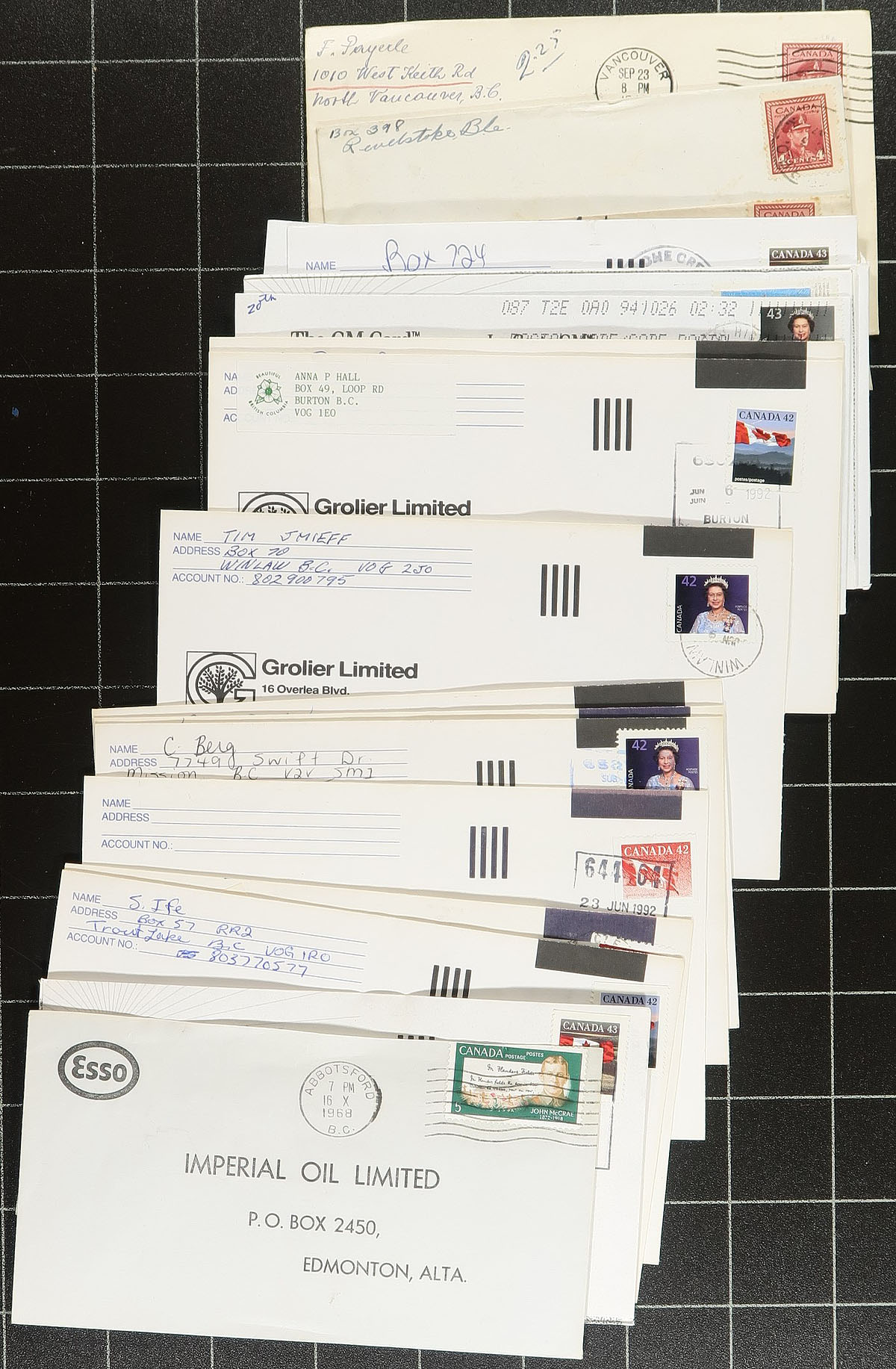 British Columbia Postal History. Group of over 500 covers collected for B.C. town postmarks, 1940's-1980's, noting towns from A to Y, with mostly POCON and MOON postmarks, along with cds, duplex, and possible other types. Just a few of the town include Agassiz, Fort St. John, Youbou, Kitwanga, Ymir, and much more. A nice lot for the postmark collector. Estimate =