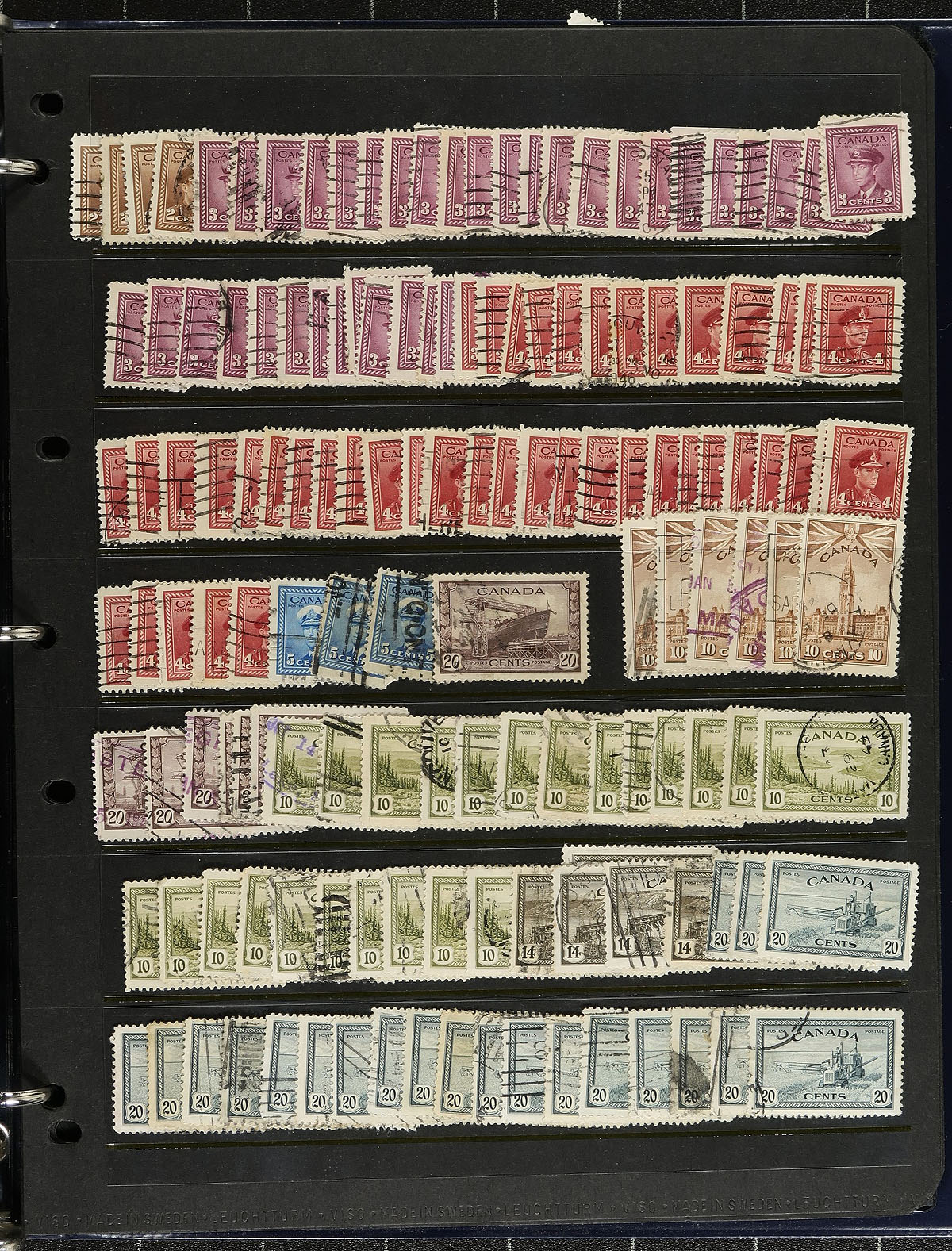 Accumulation of used Canada, Victorian era to the 1960's, containing over 1,000 stamps (including a few on piece) in a stockbook and several stock pages housed in a binder. The group generally ranges from the Leaf issues onwards, but did note a few earlier issues, with the strength of the lot in the good amount of socked on the nose town postmarks noting cds, squared circles, duplex, meters, and more. A nice lot for the postmark hunter, with online photos showing a sampling. A few probably faults within, otherwise a fine to very fine group. Estimate =