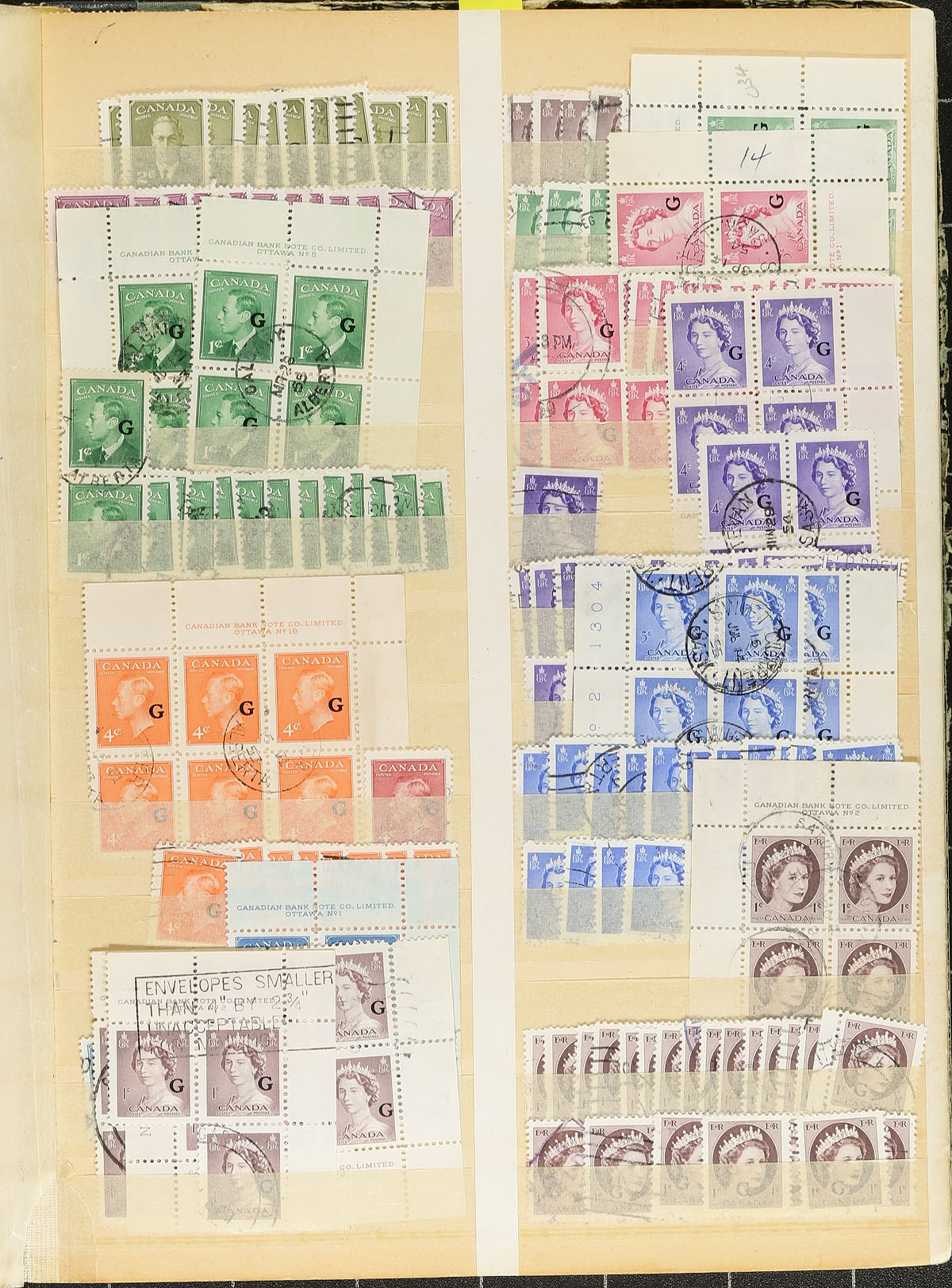 Accumulation of used Canada, Victorian era to the 1960's, containing over 1,000 stamps (including a few on piece) in a stockbook and several stock pages housed in a binder. The group generally ranges from the Leaf issues onwards, but did note a few earlier issues, with the strength of the lot in the good amount of socked on the nose town postmarks noting cds, squared circles, duplex, meters, and more. A nice lot for the postmark hunter, with online photos showing a sampling. A few probably faults within, otherwise a fine to very fine group. Estimate =