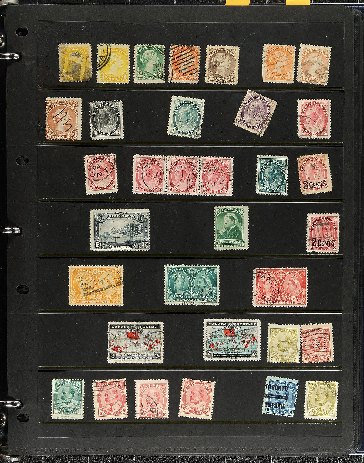 Accumulation of used Canada, Victorian era to the 1960's, containing over 1,000 stamps (including a few on piece) in a stockbook and several stock pages housed in a binder. The group generally ranges from the Leaf issues onwards, but did note a few earlier issues, with the strength of the lot in the good amount of socked on the nose town postmarks noting cds, squared circles, duplex, meters, and more. A nice lot for the postmark hunter, with online photos showing a sampling. A few probably faults within, otherwise a fine to very fine group. Estimate =