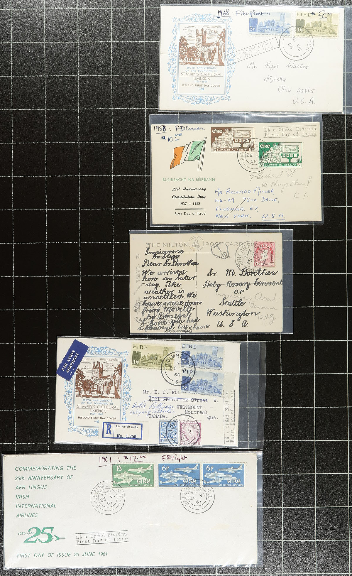 Group of roughly 200 Ireland coves, 1940's-1990's, primarily containing first day covers (noting singles and sets frankings), along with commercial mail, post cards, postal stationery, and first flights. Some of the covers have been sleeved, with retail prices ranging from $5 to $10 each. A few faults with a few of the covers, still a nice grouping for the Ireland or worldwide cover collector. Estimate =