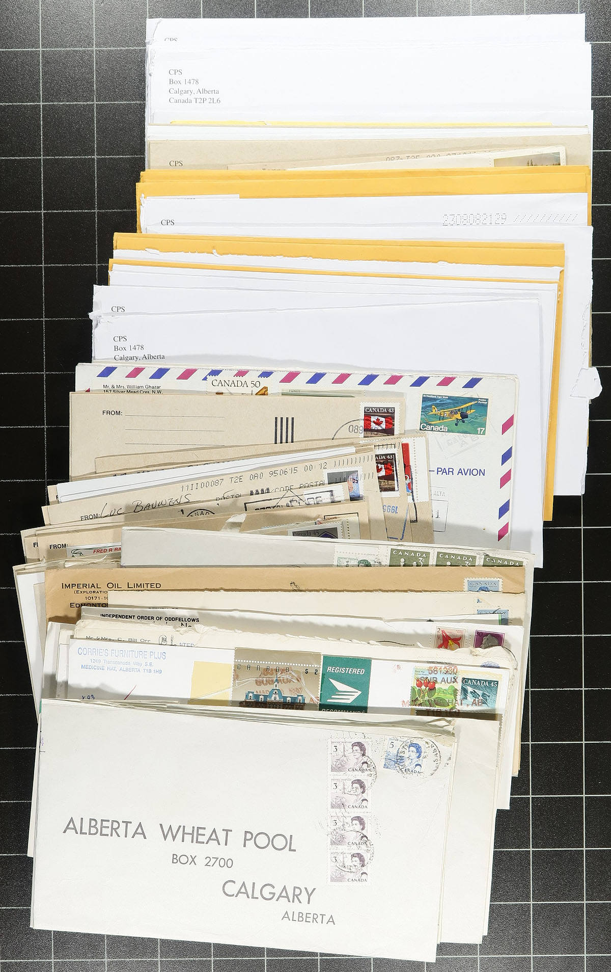 Alberta Postal History. Accumulation of roughly 800 covers, collected for Alberta postmarks, generally ranging from the 1940's into the 2000's. The vast majority appear to be first class mail, but did spot about 50 airmail covers to Holland with various frankings from the 1960's and 1970's. Postmark interest includes, cds, slogan, MOON, POCON, duplex, and more. Just a few towns include Barrhead, Bluesky, Camrose, Desmarais, Wildhorse, and much more with towns ranging from A to W. A nice lot for the Alberta, or Canada postmark collector. Estimate =