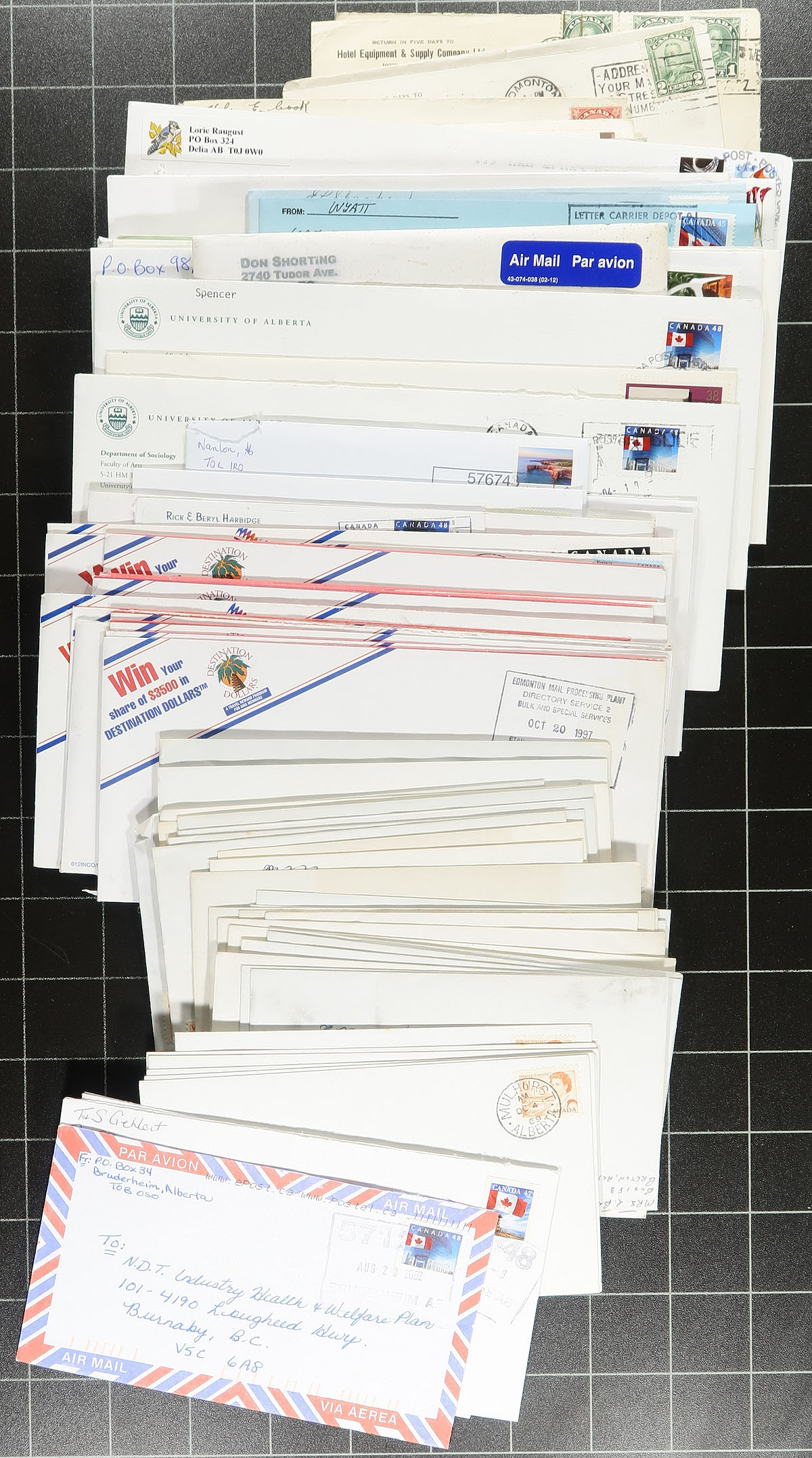 Alberta Postal History. Accumulation of roughly 800 covers, collected for Alberta postmarks, generally ranging from the 1940's into the 2000's. The vast majority appear to be first class mail, but did spot about 50 airmail covers to Holland with various frankings from the 1960's and 1970's. Postmark interest includes, cds, slogan, MOON, POCON, duplex, and more. Just a few towns include Barrhead, Bluesky, Camrose, Desmarais, Wildhorse, and much more with towns ranging from A to W. A nice lot for the Alberta, or Canada postmark collector. Estimate =