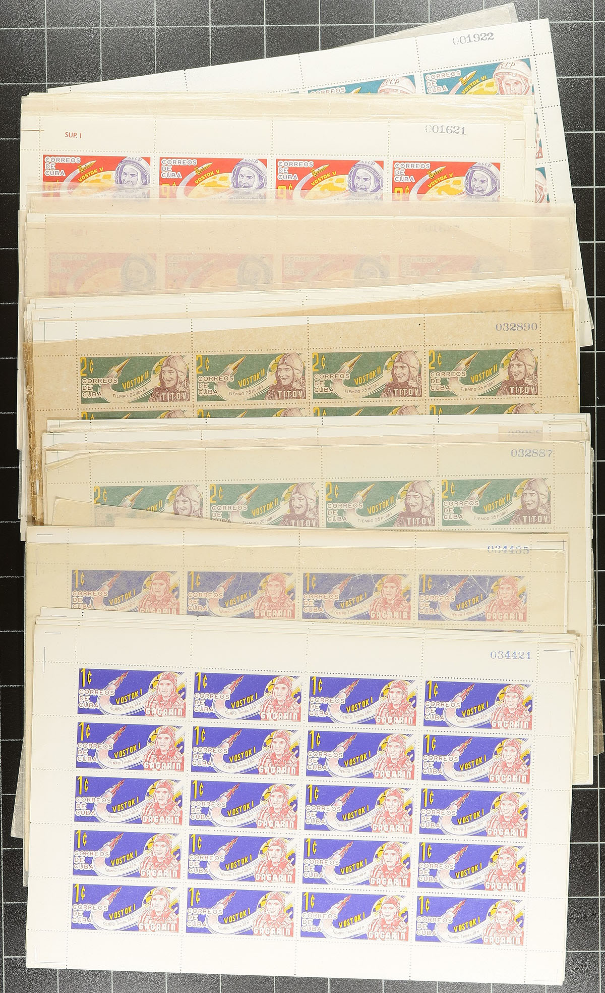 Complete Soviet space flight series of five different denominations depicting high profile cosmonauts, issued 1963-1964 in complete sheets of 20. Each denomination has six complete mint, never hinged, sheets, with the exception of the 2c which has five compete sheets and one missing a vertical row and its five stamps). Most have original wax paper interleaves which have kept these clean and in reasonable condition, although a few selvedge faults or separation are to be expected. 2024 Scott US$734.75 =