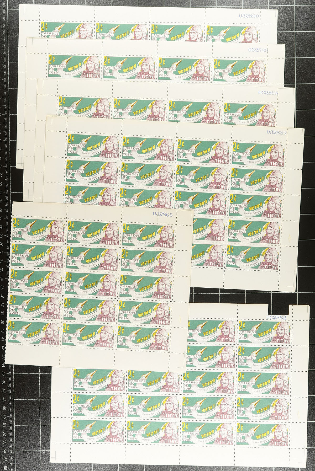 Complete Soviet space flight series of five different denominations depicting high profile cosmonauts, issued 1963-1964 in complete sheets of 20. Each denomination has six complete mint, never hinged, sheets, with the exception of the 2c which has five compete sheets and one missing a vertical row and its five stamps). Most have original wax paper interleaves which have kept these clean and in reasonable condition, although a few selvedge faults or separation are to be expected. 2024 Scott US$734.75 =